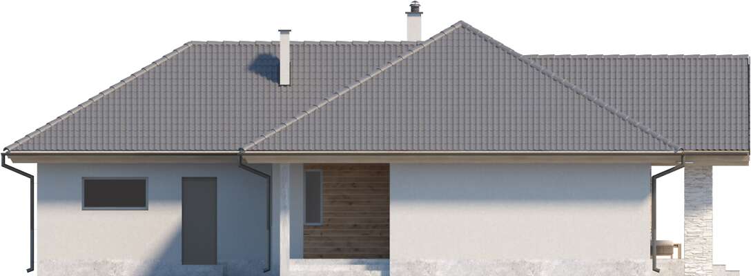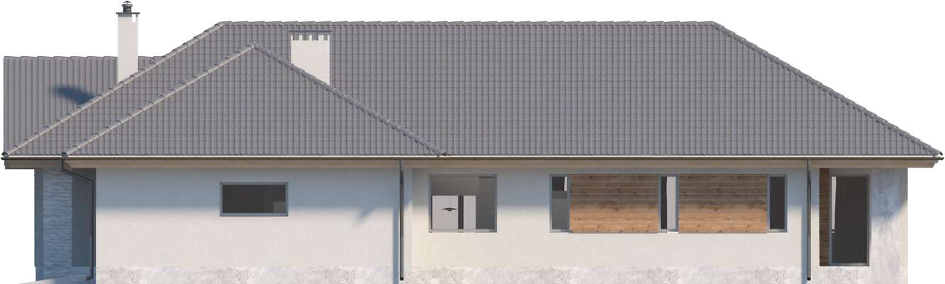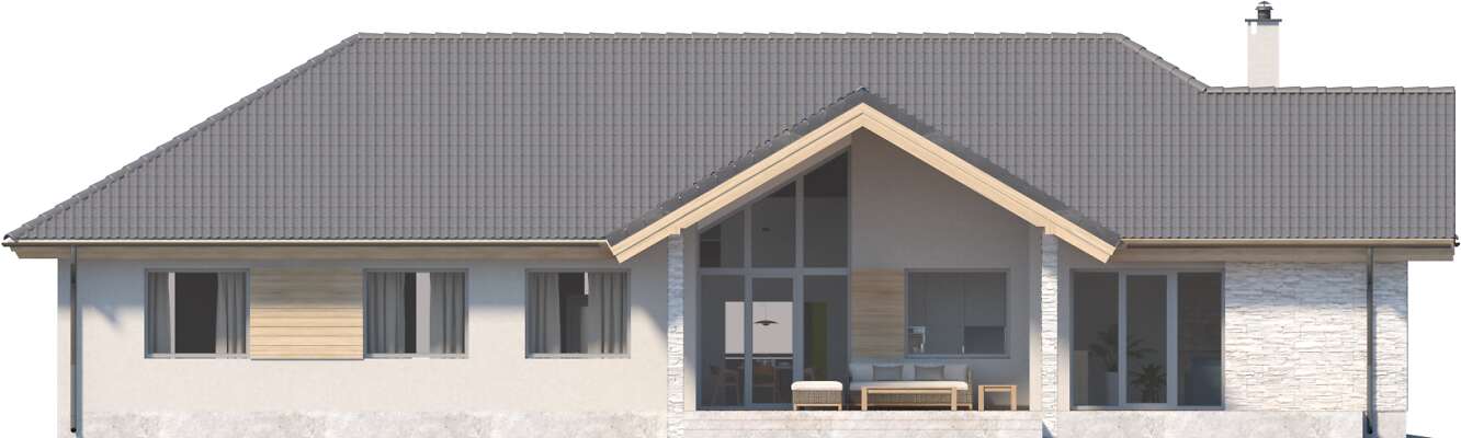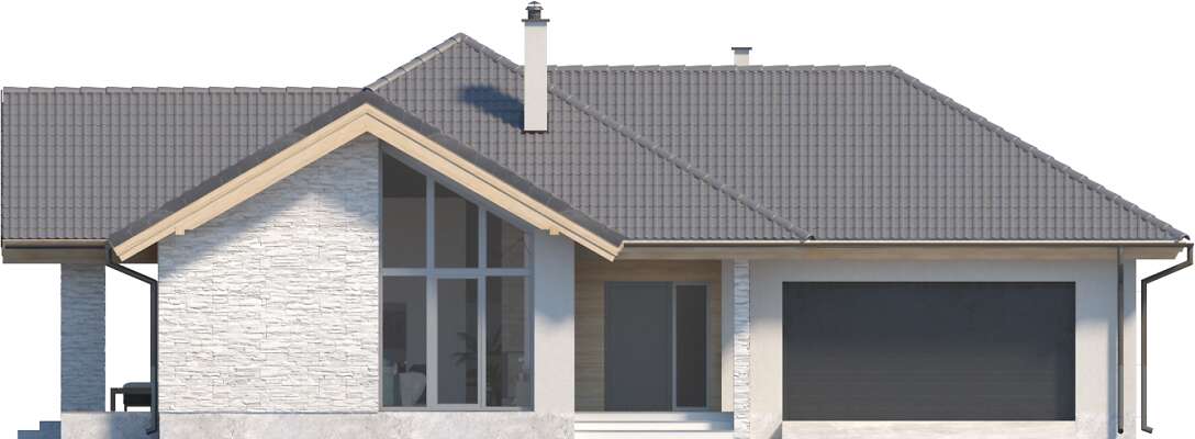 Wygodny, przestronny dom parterowy, zwracający uwagę głównie ciekawą bryłą i dużymi przeszkleniami, dzięki którym wnętrze jest pełne światła. Mieszkańcy mają do dyspozycji obszerny salon, ciekawie zaaranżowaną kuchnię z jadalnią, gabinet, trzy sypialnie, w tym jedną z łazienką, spiżarnię, wc i wspólną łazienkę. Za dwustanowiskowym garażem, wkomponowanym w bryłę domu, znajduje się pomieszczenie z kotłownią, która ma niezależne wyjście na zewnątrz. Dom, dzięki usytuowaniu salonu od strony wejściowej, doskonale nadaje się na działki z wejściem od południa.