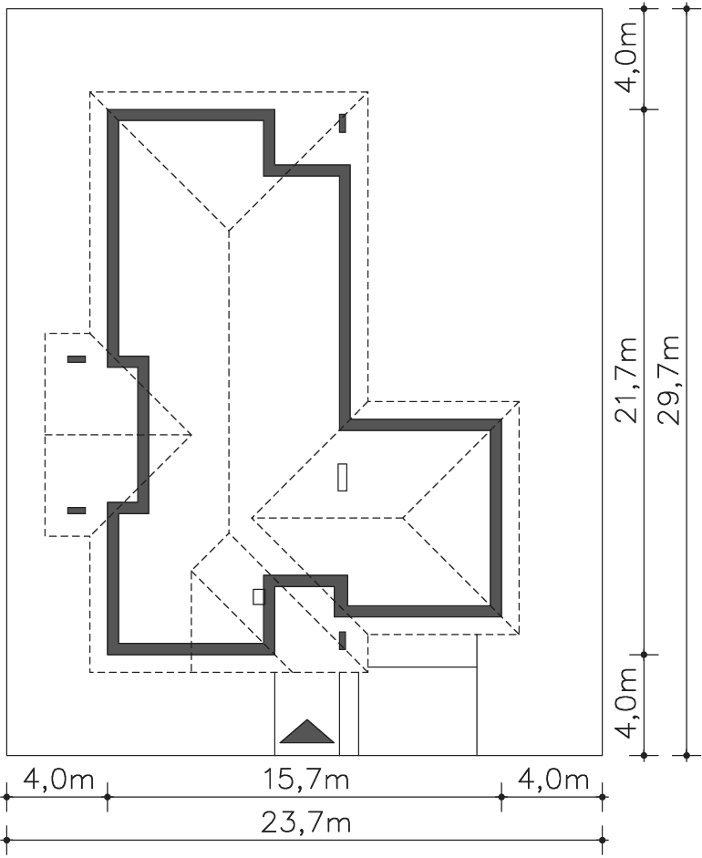 Grafika przedstawia minimalne wymiary działki. Aby sprawdzić, czy dom może być realizowany na konkretnej działce należy uzyskać Wypis i Wyrys z Miejscowego Planu Zagospodarowania Przestrzennego lub jeśli na danym terenie nie ma planu – Decyzję o warunkach zabudowy. Wszystkie projekty wymagają adaptacji do warunków miejscowych przez projektanta lokalnego.