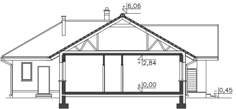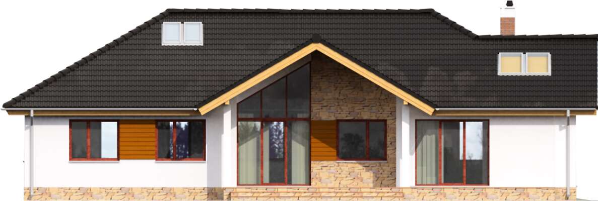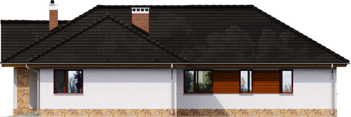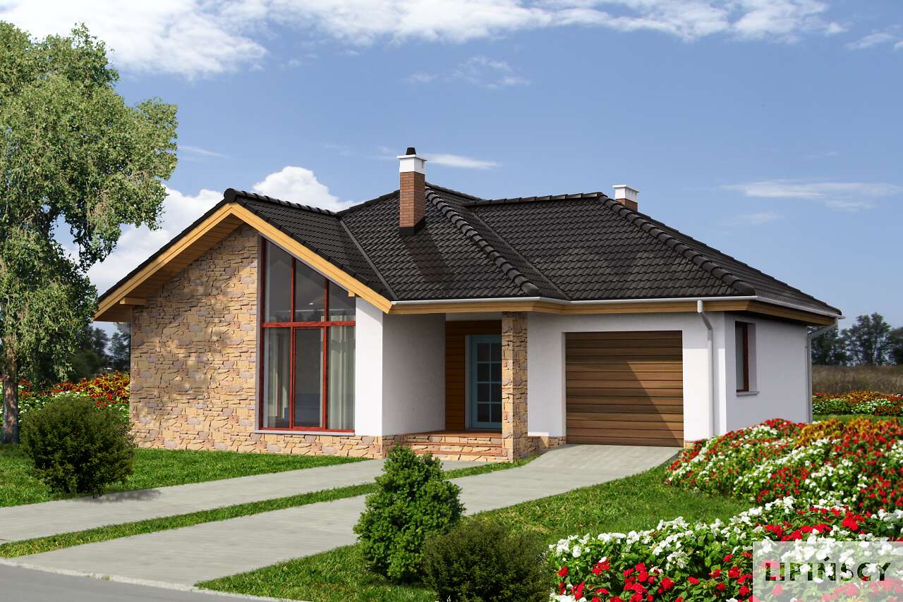 Piękny dom parterowy, nadający się na działkę z wjazdem od południa. Niebanalna bryła z charakterystycznym, dużym przeszkleniem w ścianie frontowej, zdecydowanie zwraca uwagę. Wnętrze podzielono na dwie wyraźne strefy, dzienną i nocną. W dziennej znajduje się duży wiatrołap, piękny, wysoki salon, kuchnia, spiżarnia, jadalnia i gabinet i wc. Część nocna, prywatna to trzy ustawne sypialnie, komfortowa łazienka i garderoba. Z wnętrza domu można przejść do jednostanowiskowego garażu, a za nim znajduje się kotłownia z wyjściem na zewnątrz.