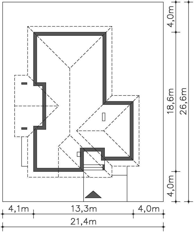 Grafika przedstawia minimalne wymiary działki. Aby sprawdzić, czy dom może być realizowany na konkretnej działce należy uzyskać Wypis i Wyrys z Miejscowego Planu Zagospodarowania Przestrzennego lub jeśli na danym terenie nie ma planu – Decyzję o warunkach zabudowy. Wszystkie projekty wymagają adaptacji do warunków miejscowych przez projektanta lokalnego.
