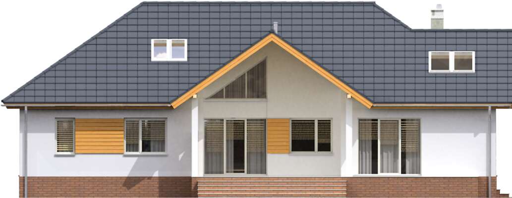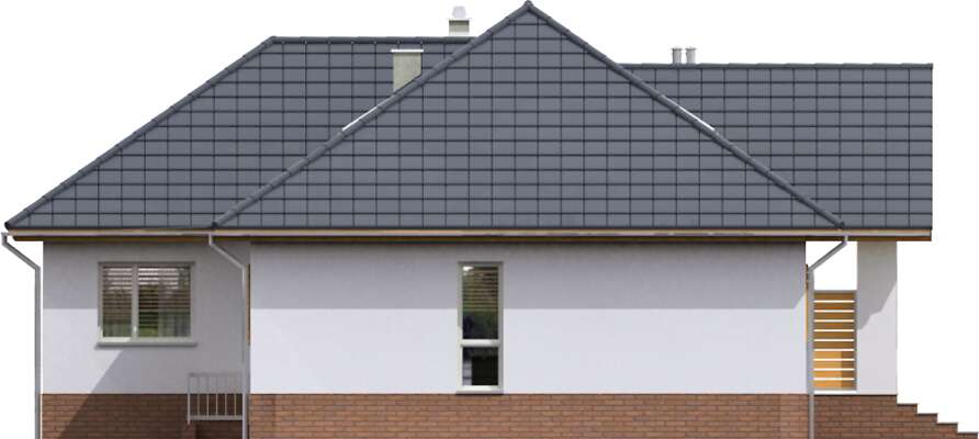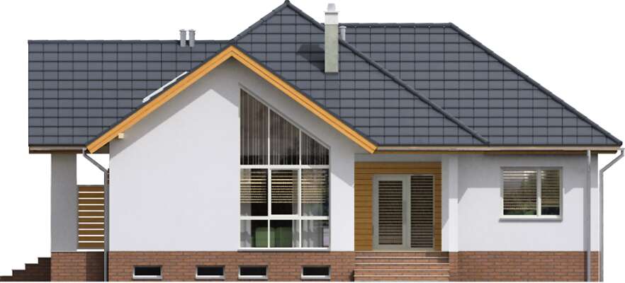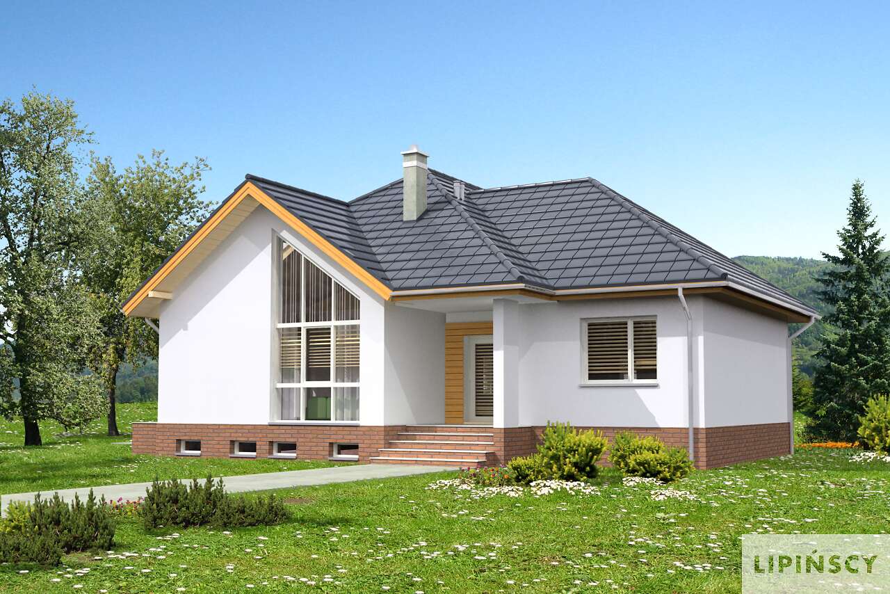 Kolejna wersja pięknego, energooszczędnego domu parterowego, o doskonale rozplanowanym wnętrzu i ciekawej, przeszklonej elewacji, tym razem z podpiwniczeniem. Uwagę zwraca ciekawie zaaranżowany salon z wysokim sufitem i dużymi oknami, dzięki czemu wnętrze jest pełne naturalnego światła. Dzięki usytuowaniu tej części domu od frontu, idealnie nadaje się on na działkę z wjazdem od południa. Do dyspozycji mieszkańców jest również wygodna, zamknięta kuchnia, jadalnia, obszerna garderoba, cztery sypialnie i dwie łazienki. Taras, umieszczony od strony kuchni i jadalni – dzięki dużym przeszkleniom, stanowi niemal ich integralną część.