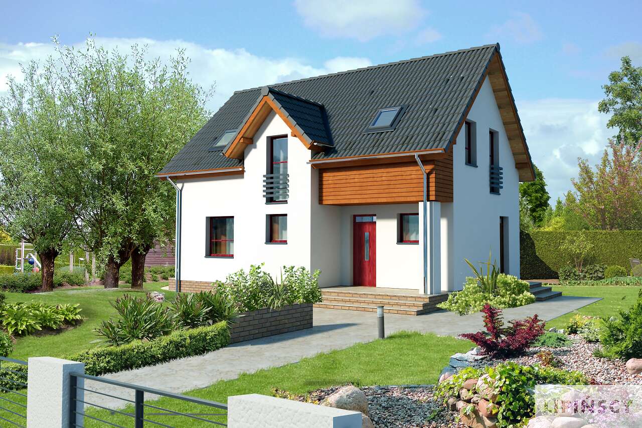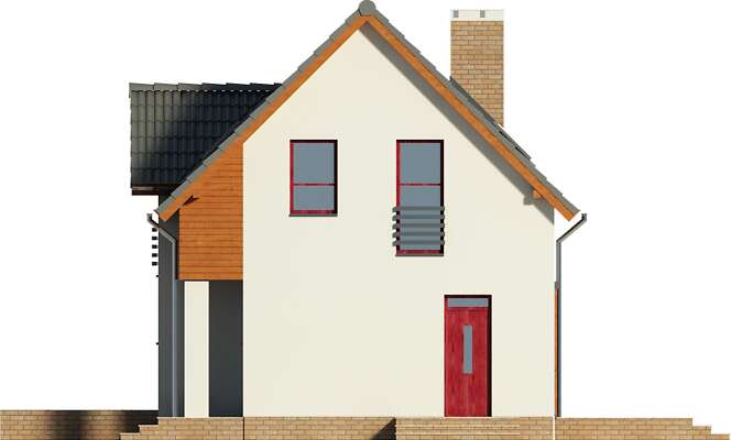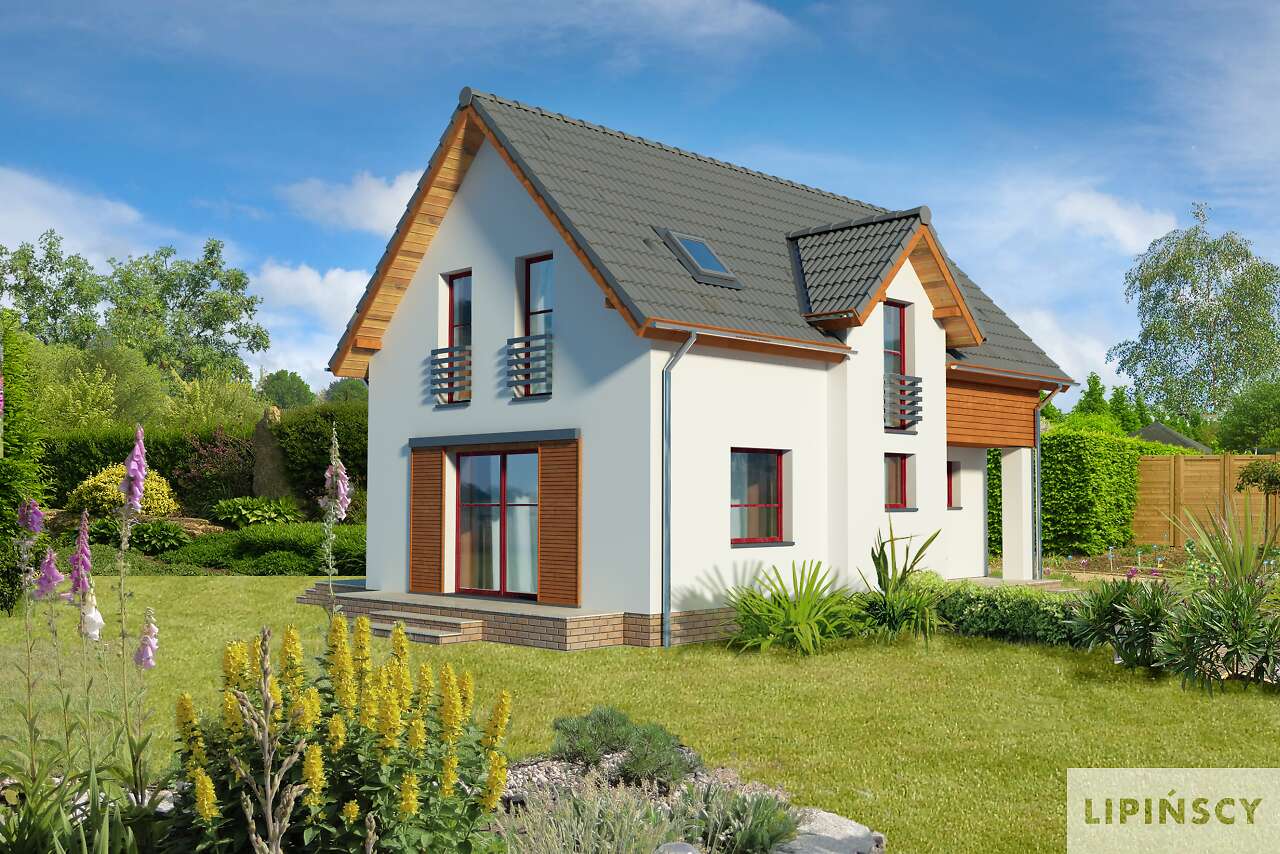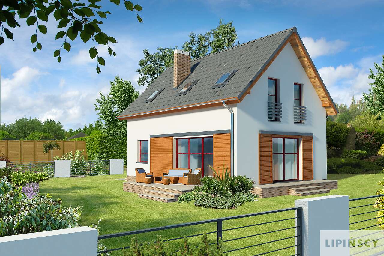 Energooszczędny dom z użytkowym poddaszem, z ciekawymi elementami drewnianymi i metalowymi w elewacji. Na parterze znajduje się kuchnia, wygodny salon, obszerny wiatrołap, wc i kotłownia. Poddasze zajmują trzy ustawne sypialnie i jasna, duża łazienka. Prostą bryłę uatrakcyjnia ciekawe rozwiązanie klatki schodowej. Ten przytulny dom to doskonała propozycja dla osób szukających projektu funkcjonalnego i niedrogiego w późniejszej eksploatacji.