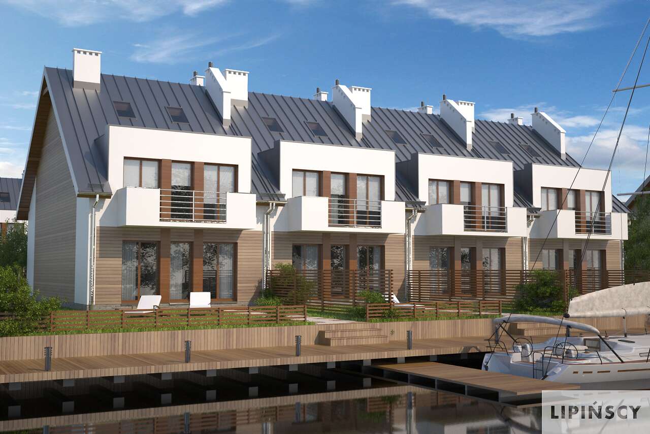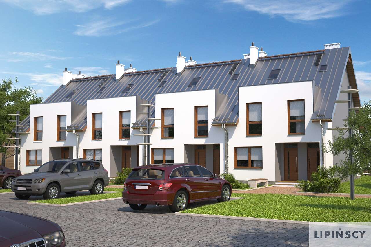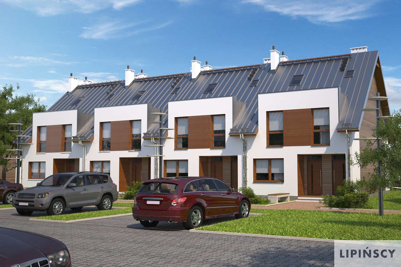 Dom szeregowy dwumieszkaniowy. Mieszkanie na parterze przeznaczone jest dla małej rodziny np. dla seniorów. Posiada opcjonalnie możliwość zwiększenia salonu kosztem jednej z sypialni. Drugie mieszkanie jest dwukondygnacyjne i posiada duże możliwości aranżacyjne. Pomieszczenie na górnej kondygnacji może być pokojem zabaw dla dzieci, dużą sypialnią dla rodziców lub też pracownią bądź gabinetem.