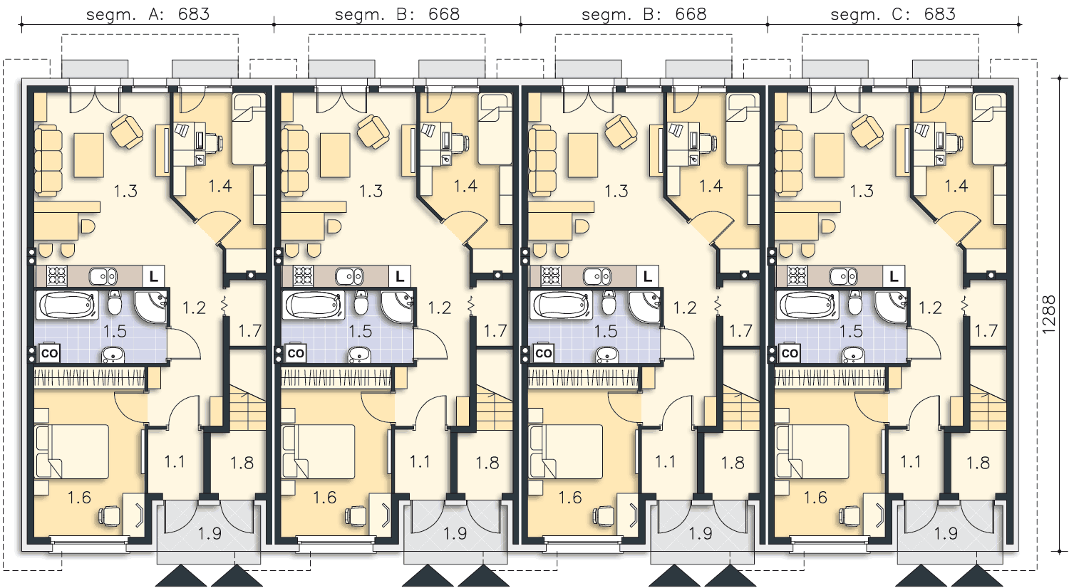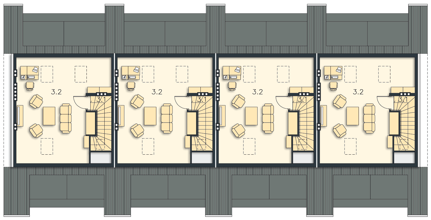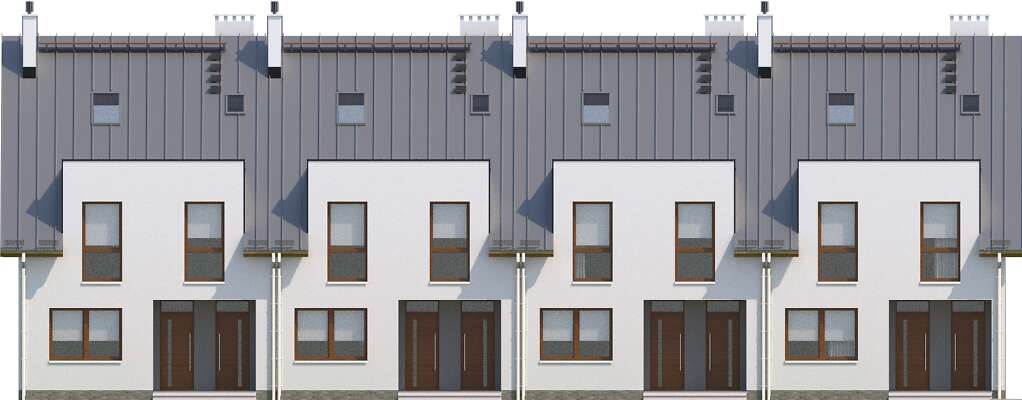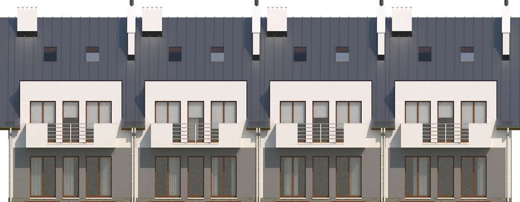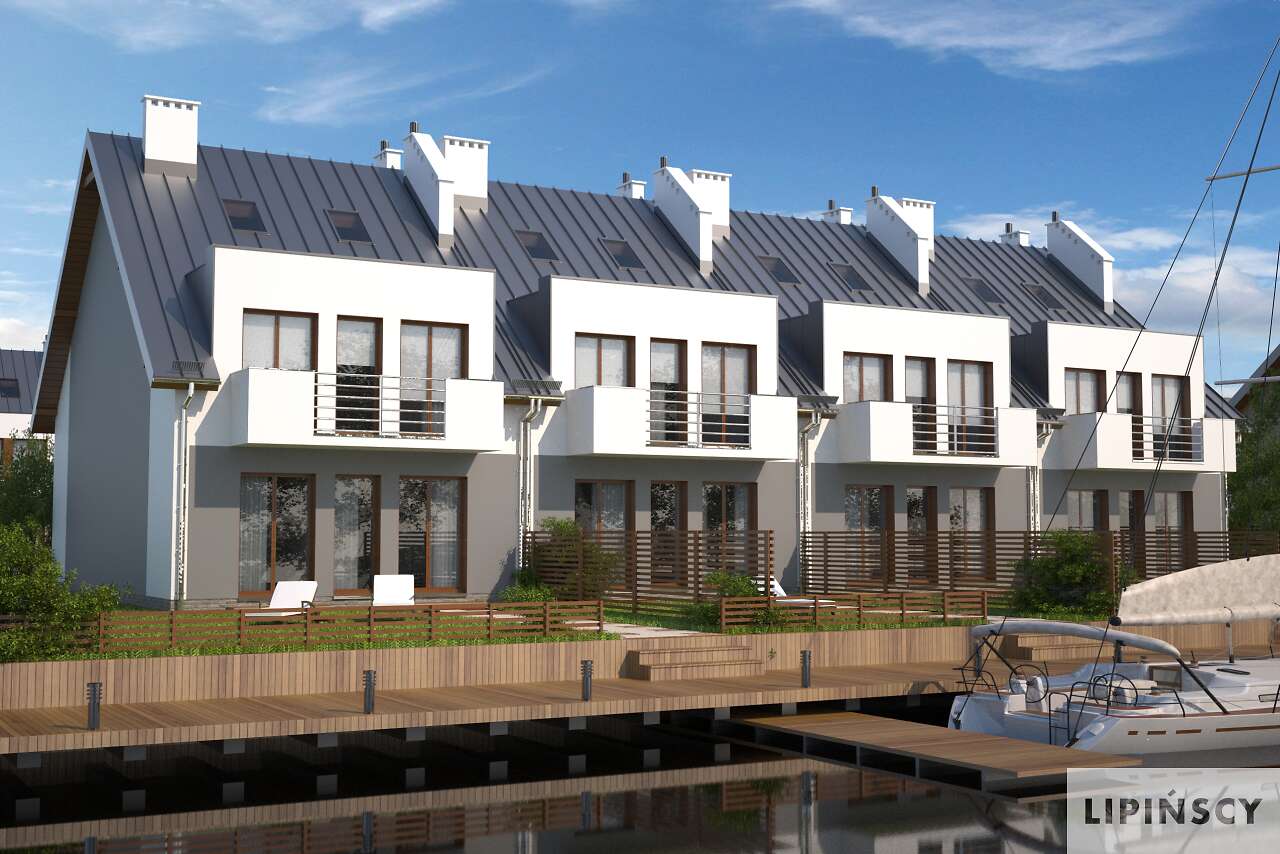 Dom szeregowy dwumieszkaniowy. Mieszkanie na parterze przeznaczone jest dla małej rodziny np. dla seniorów. Posiada opcjonalnie możliwość zwiększenia salonu kosztem jednej z sypialni. Drugie mieszkanie jest dwukondygnacyjne i posiada duże możliwości aranżacyjne. Pomieszczenie na górnej kondygnacji może być pokojem zabaw dla dzieci, dużą sypialnią dla rodziców lub też pracownią bądź gabinetem.