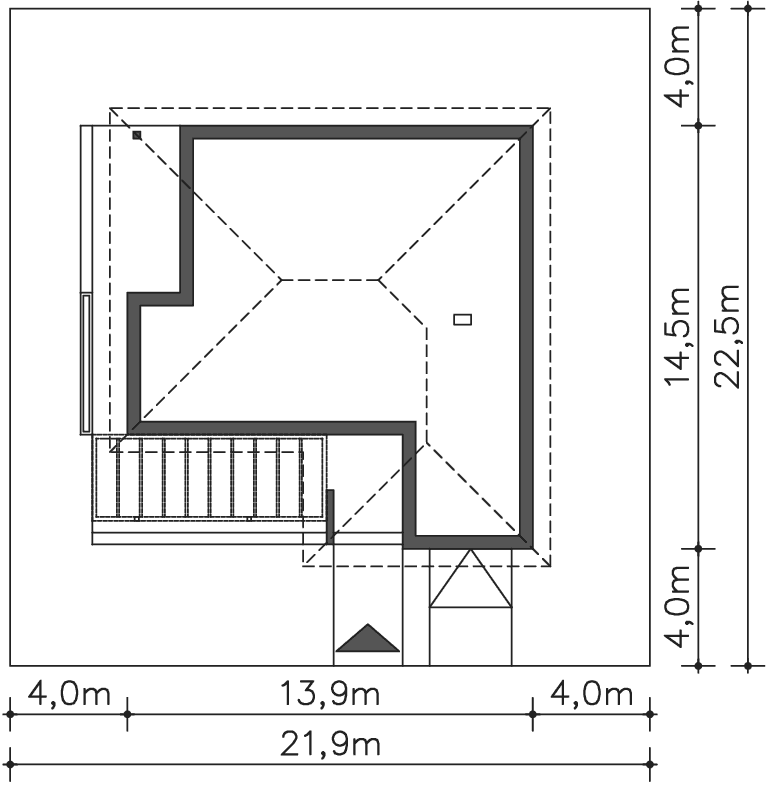 Grafika przedstawia minimalne wymiary działki. Aby sprawdzić, czy dom może być realizowany na konkretnej działce należy uzyskać Wypis i Wyrys z Miejscowego Planu Zagospodarowania Przestrzennego lub jeśli na danym terenie nie ma planu – Decyzję o warunkach zabudowy. Wszystkie projekty wymagają adaptacji do warunków miejscowych przez projektanta lokalnego.