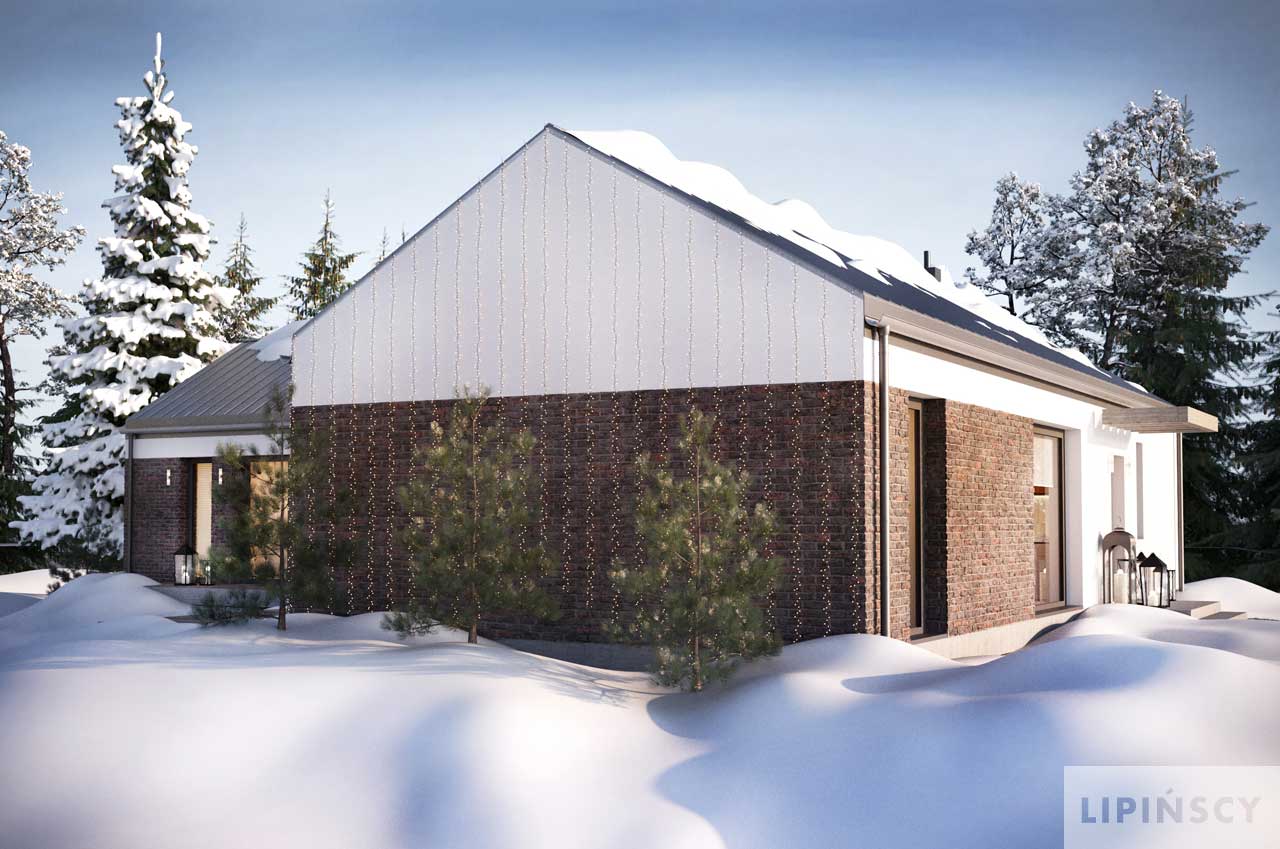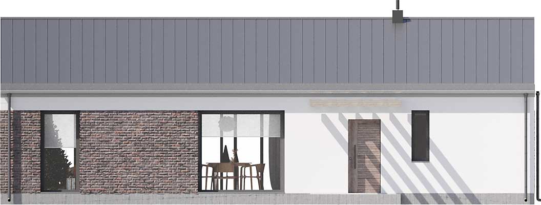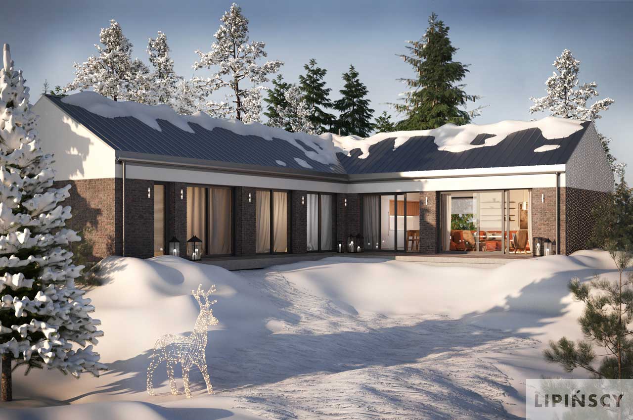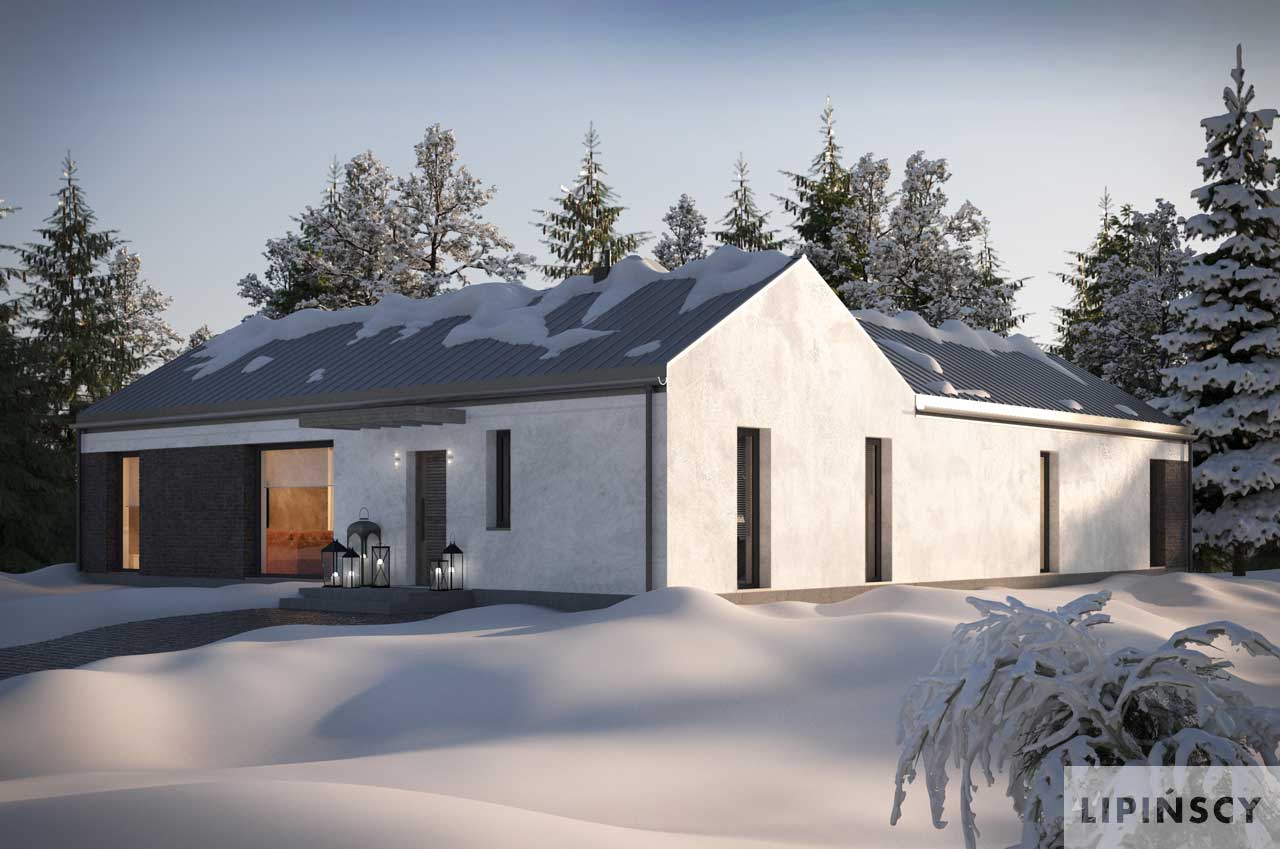 Nowoczesny dom parterowy, z dwuspadowym bez okapowym dachem, na rzucie litery L. Spełnienie marzeń o niewielkim nowoczesnym domu, rozplanowanym wokół wewnętrznego dziedzińca. Ogród jest tu bardzo ważnym elementem użytkowym domu. Wszystkie główne pomieszczenia są usytuowane wokół dziedzińca i posiadają duże przeszklenia umożliwiające bezpośrednie korzystanie z uroków otaczającej natury. Bryła domu również doskonale zespoli się z naturą, przez co dom ten może być intrygującą propozycją dla ludzi ukierunkowanych na ekologiczne rozwiązania i poszanowanie natury. Układ funkcjonalny jest bardzo przejrzysty: część dzienna to otwarta przestrzeń o wysokim wnętrzu, obejmuje salon i kuchnia z jadalnią oraz część nocna to trzy sypialnie, w tym wydzielony apartament rodziców z własną łazienką i garderobą oraz dwie dodatkowe łazienki. Przy wejściu jest pomieszczenie gospodarcze z kotłem gazowym, który może być zamieniony na pompę ciepła w ramach adaptacji do warunków miejscowych. W projekcie przewidziano ogrzewanie kotłem na gaz. Możliwa jest zmiana ogrzewania na pompę ciepła.