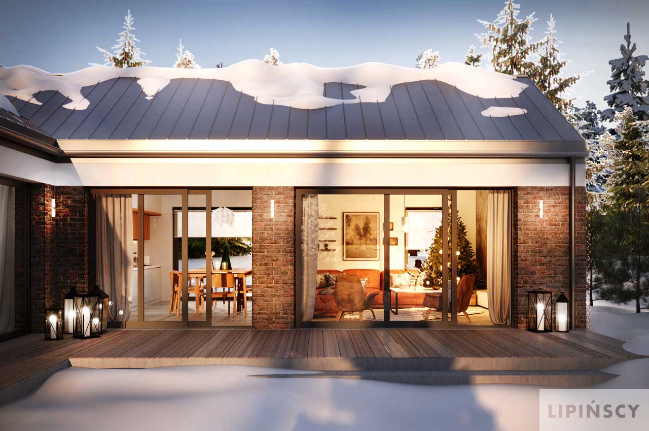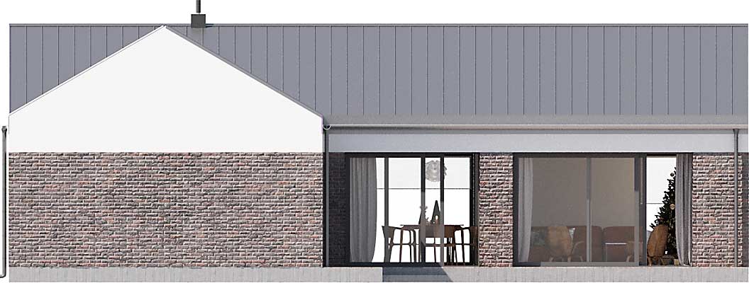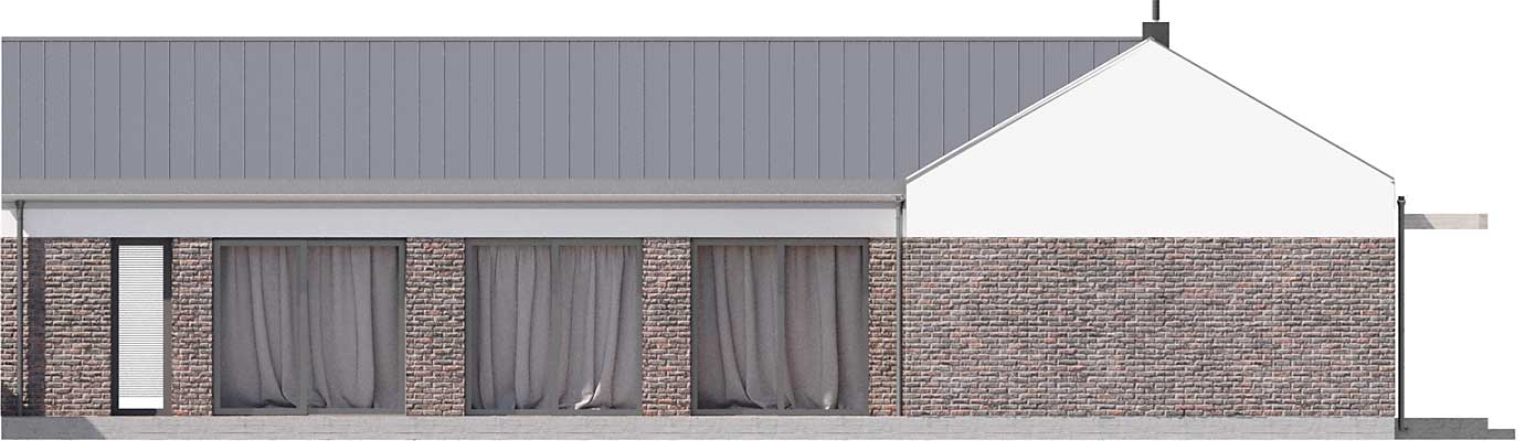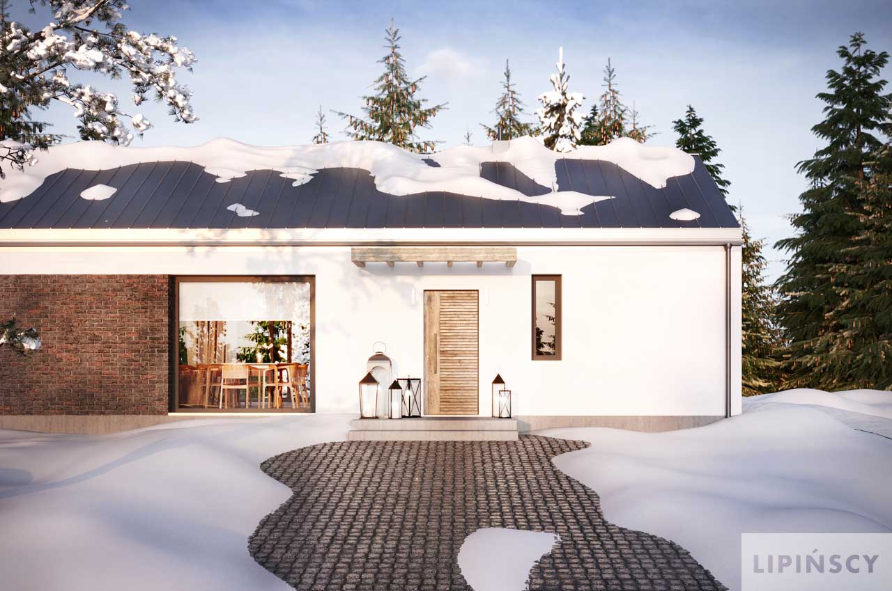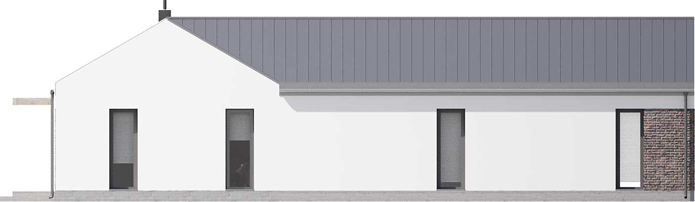 Nowoczesny dom parterowy, z dwuspadowym bez okapowym dachem, na rzucie litery L. Spełnienie marzeń o niewielkim nowoczesnym domu, rozplanowanym wokół wewnętrznego dziedzińca. Ogród jest tu bardzo ważnym elementem użytkowym domu. Wszystkie główne pomieszczenia są usytuowane wokół dziedzińca i posiadają duże przeszklenia umożliwiające bezpośrednie korzystanie z uroków otaczającej natury. Bryła domu również doskonale zespoli się z naturą, przez co dom ten może być intrygującą propozycją dla ludzi ukierunkowanych na ekologiczne rozwiązania i poszanowanie natury. Układ funkcjonalny jest bardzo przejrzysty: część dzienna to otwarta przestrzeń o wysokim wnętrzu, obejmuje salon i kuchnia z jadalnią oraz część nocna to trzy sypialnie, w tym wydzielony apartament rodziców z własną łazienką i garderobą oraz dwie dodatkowe łazienki. Przy wejściu jest pomieszczenie gospodarcze z kotłem gazowym, który może być zamieniony na pompę ciepła w ramach adaptacji do warunków miejscowych. W projekcie przewidziano ogrzewanie kotłem na gaz. Możliwa jest zmiana ogrzewania na pompę ciepła.