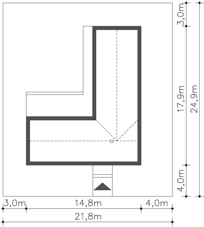 Grafika przedstawia minimalne wymiary działki. Aby sprawdzić, czy dom może być realizowany na konkretnej działce należy uzyskać Wypis i Wyrys z Miejscowego Planu Zagospodarowania Przestrzennego lub jeśli na danym terenie nie ma planu – Decyzję o warunkach zabudowy. Wszystkie projekty wymagają adaptacji do warunków miejscowych przez projektanta lokalnego.
