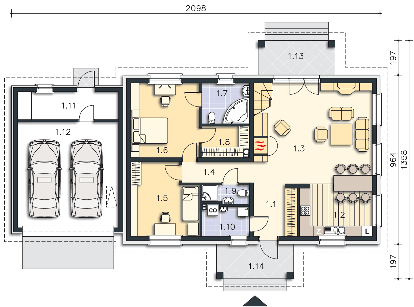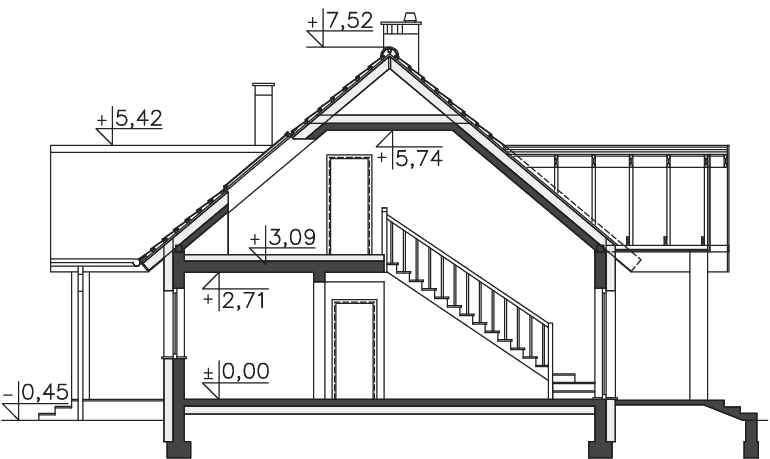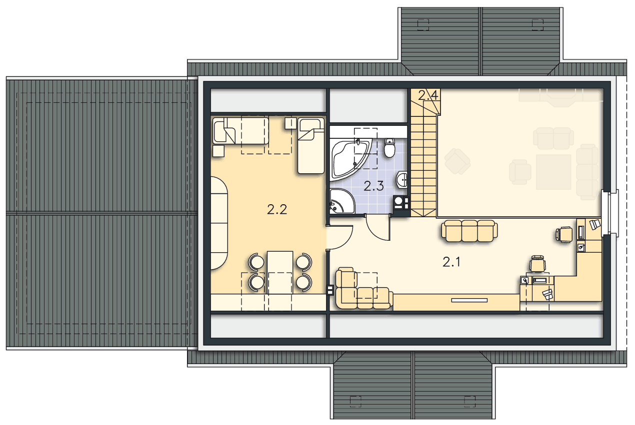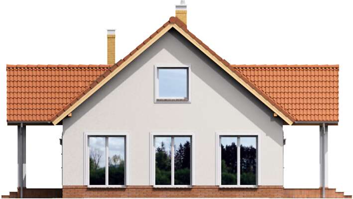 Prosty dom o wyszukanym wnętrzu, w którym życie rodzinne skupia się głównie w otwartym salonie. Jego przestronność podkreśla antresola oraz duże okna w ścianie szczytowej, przez które ogród przenika do wnętrza. Oprócz strefy dziennej na parterze znajdują się dwie duże sypialnie, w tym jedna idealnie nadająca się dla rodziców, ponieważ posiada własną łazienkę i garderobę. Poddasze natomiast zdominował duży hol, w którym można urządzić pracownię komputerową (pokój gościnny).