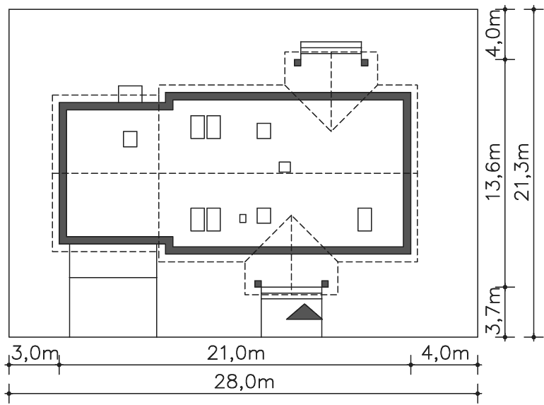 Grafika przedstawia minimalne wymiary działki. Aby sprawdzić, czy dom może być realizowany na konkretnej działce należy uzyskać Wypis i Wyrys z Miejscowego Planu Zagospodarowania Przestrzennego lub jeśli na danym terenie nie ma planu – Decyzję o warunkach zabudowy. Wszystkie projekty wymagają adaptacji do warunków miejscowych przez projektanta lokalnego.