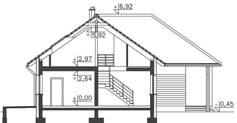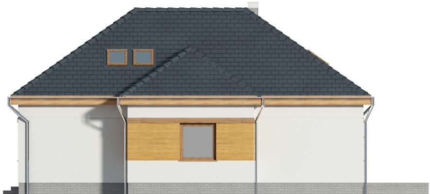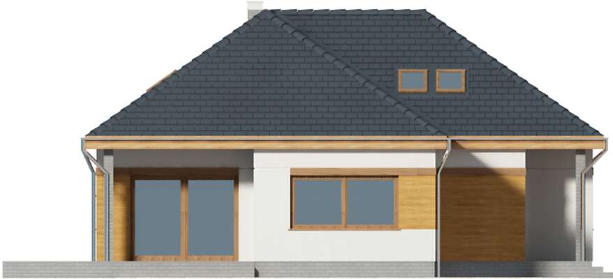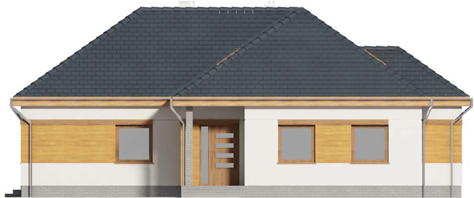 Prosty, energooszczędny dom parterowy, doskonały na działkę z wjazdem od południa, w którym mieszkańcy mają do dyspozycji duży salon z jadalnią i kominkiem, ustawną kuchnię, spiżarnię, kotłownię wc, dużą łazienkę, trzy gabinety i dodatkowy pokój, mogący służyć jako pokój gościnny. Poddasze zaadaptowano na dwa pokoje, część rekreacyjną, i dużą łazienkę. Dzięki dużym, przeszklonym drzwiom wnętrze domu jest bardzo dobrze doświetlone, a zadaszony taras jest doskonałym miejscem do rodzinnych spotkań na świeżym powietrzu.