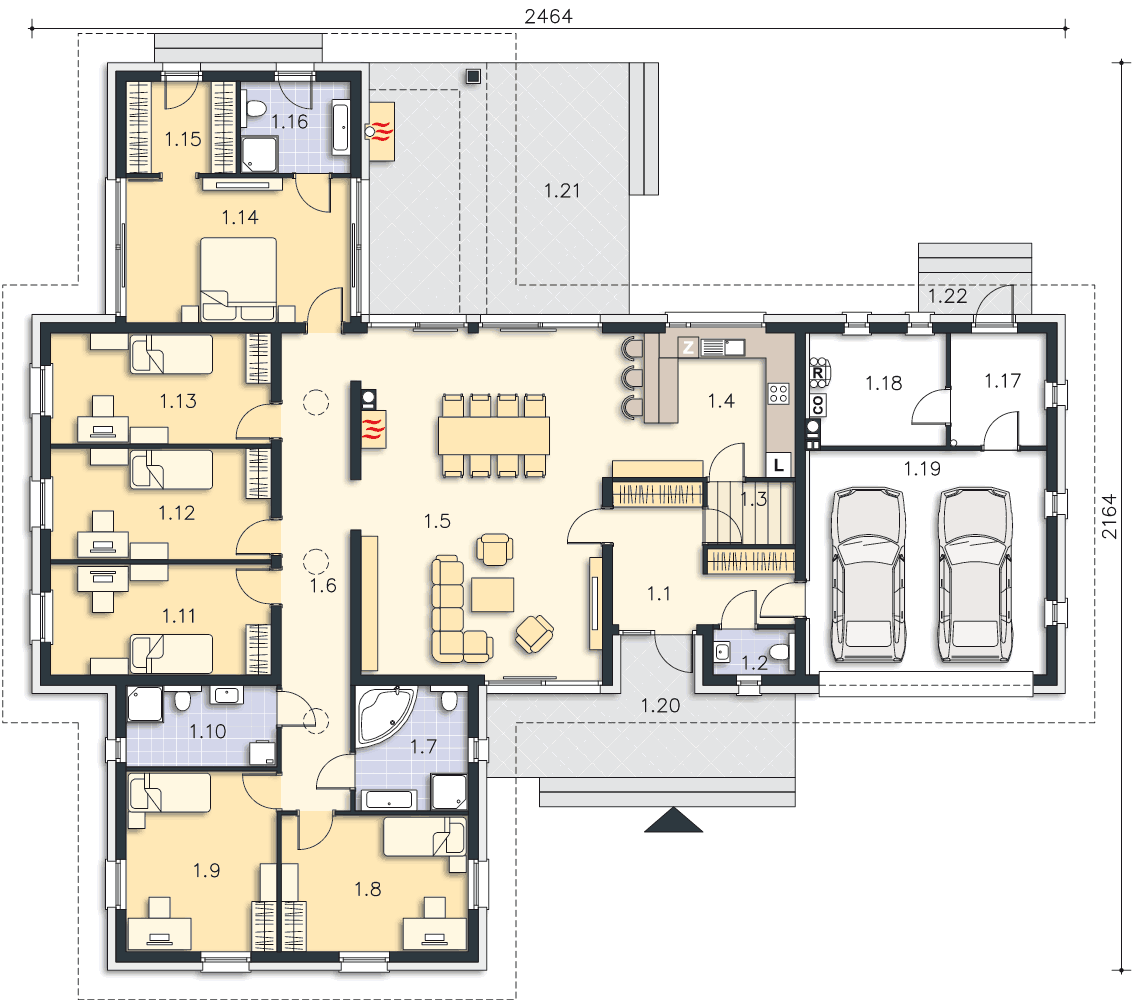 Jest możliwość przeniesienia garażu. W takim przypadku najsensowniejsze byłoby umiejscowienie go od strony wysuniętej do przodu części z pokojami 1.9 i 1.8.