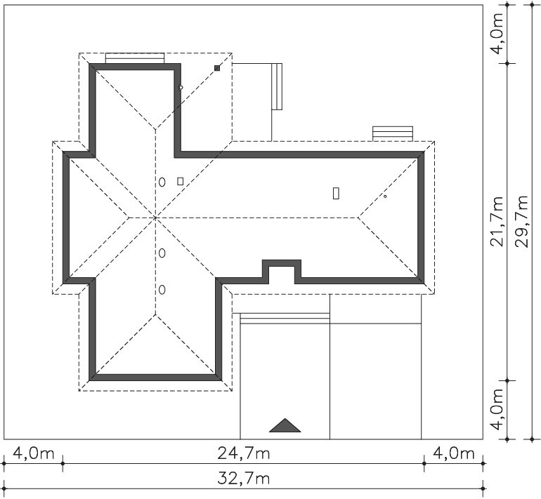 Grafika przedstawia minimalne wymiary działki. Aby sprawdzić, czy dom może być realizowany na konkretnej działce należy uzyskać Wypis i Wyrys z Miejscowego Planu Zagospodarowania Przestrzennego lub jeśli na danym terenie nie ma planu – Decyzję o warunkach zabudowy. Wszystkie projekty wymagają adaptacji do warunków miejscowych przez projektanta lokalnego.