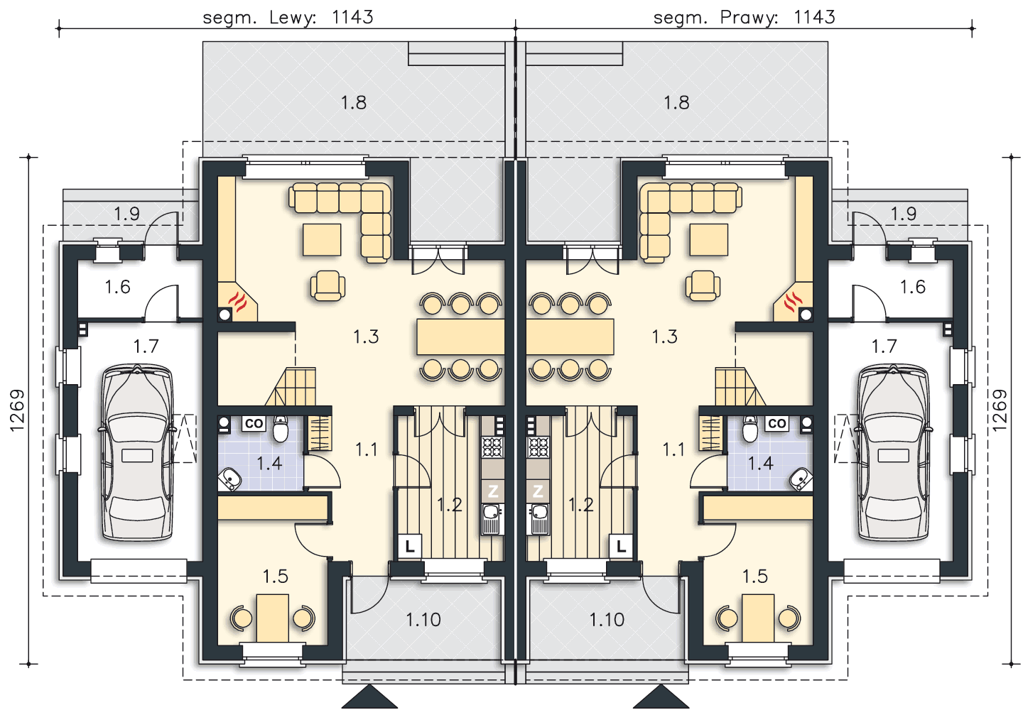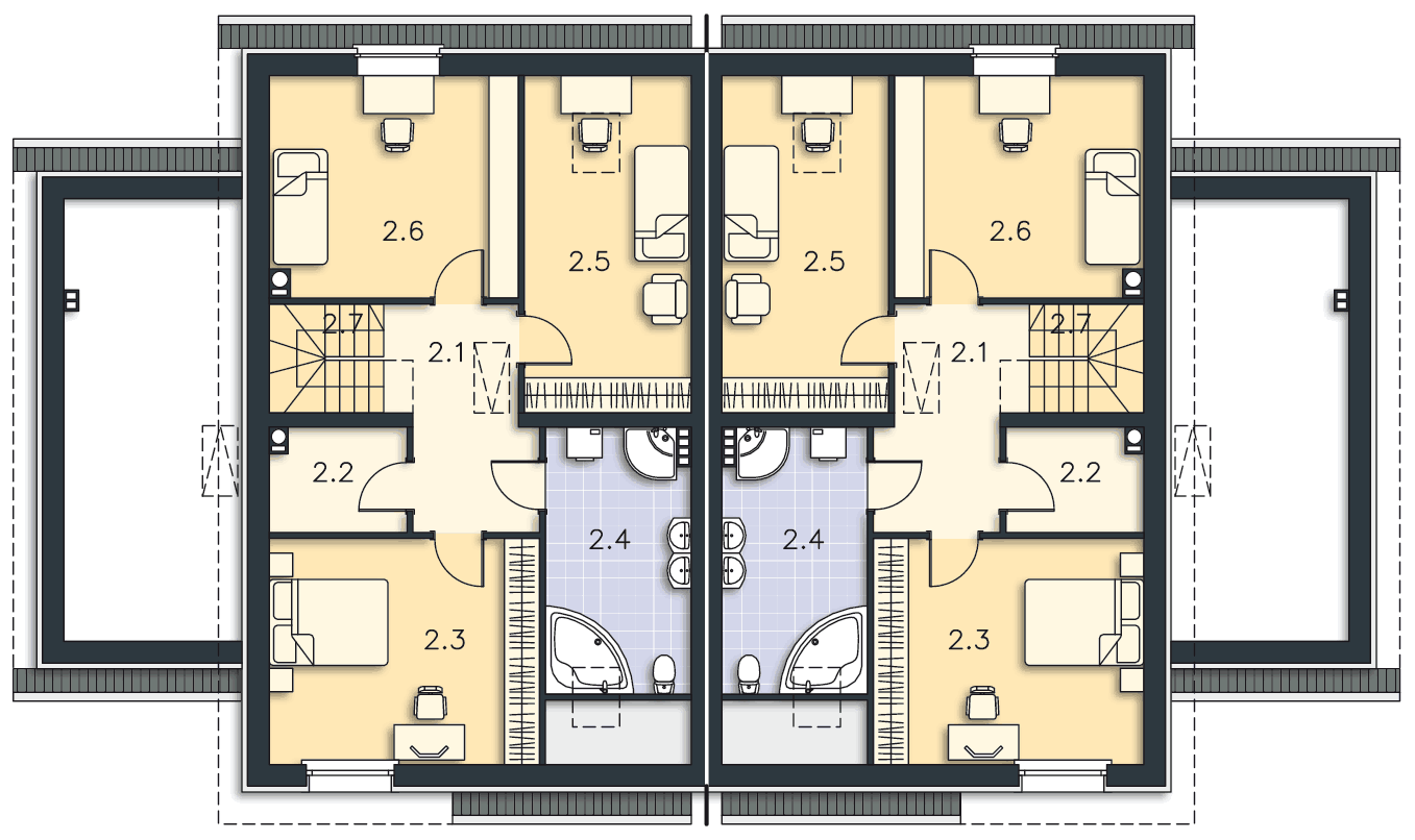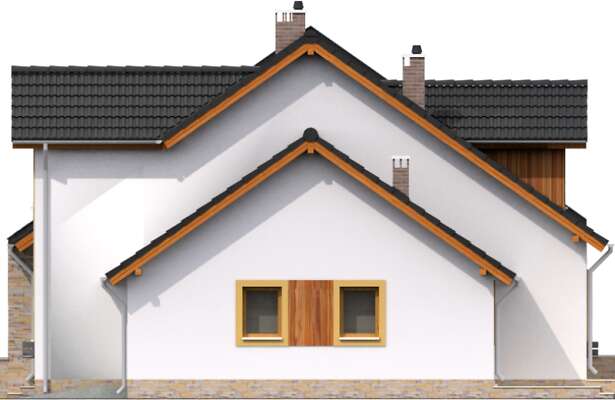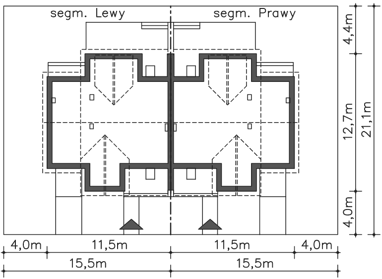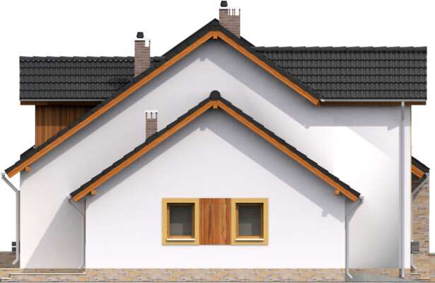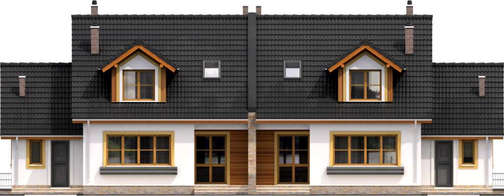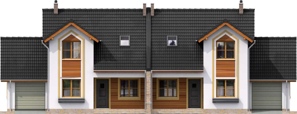 Jest to tradycyjny dom w zabudowie bliźniaczej. W każdym z segmentów mieszkać może wygodnie czteroosobowa rodzina. Na parterze przewidziano również gabinet, który według potrzeb może pełnić rolę pokoju gościnnego czy dodatkowej sypialni. Aneks kominkowy oraz jadalnia z wyjściem na zadaszony taras stanowią przestrzeń pokoju dziennego. Stąd też prowadzą schody na poddasze, gdzie zlokalizowano trzy sypialnie, łazienkę oraz pomieszczenie gospodarcze. Charakterystyczną cechą bryły budynku jest wertykalna część z gabinetem i sypialnią na poddaszu oraz podcienia tarasu wejściowego i ogrodowego, wsparte na kolumnach.