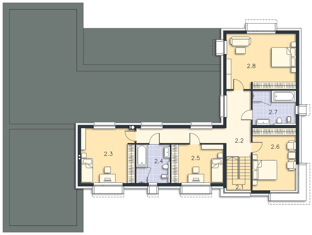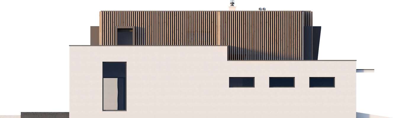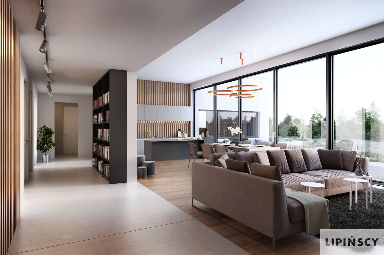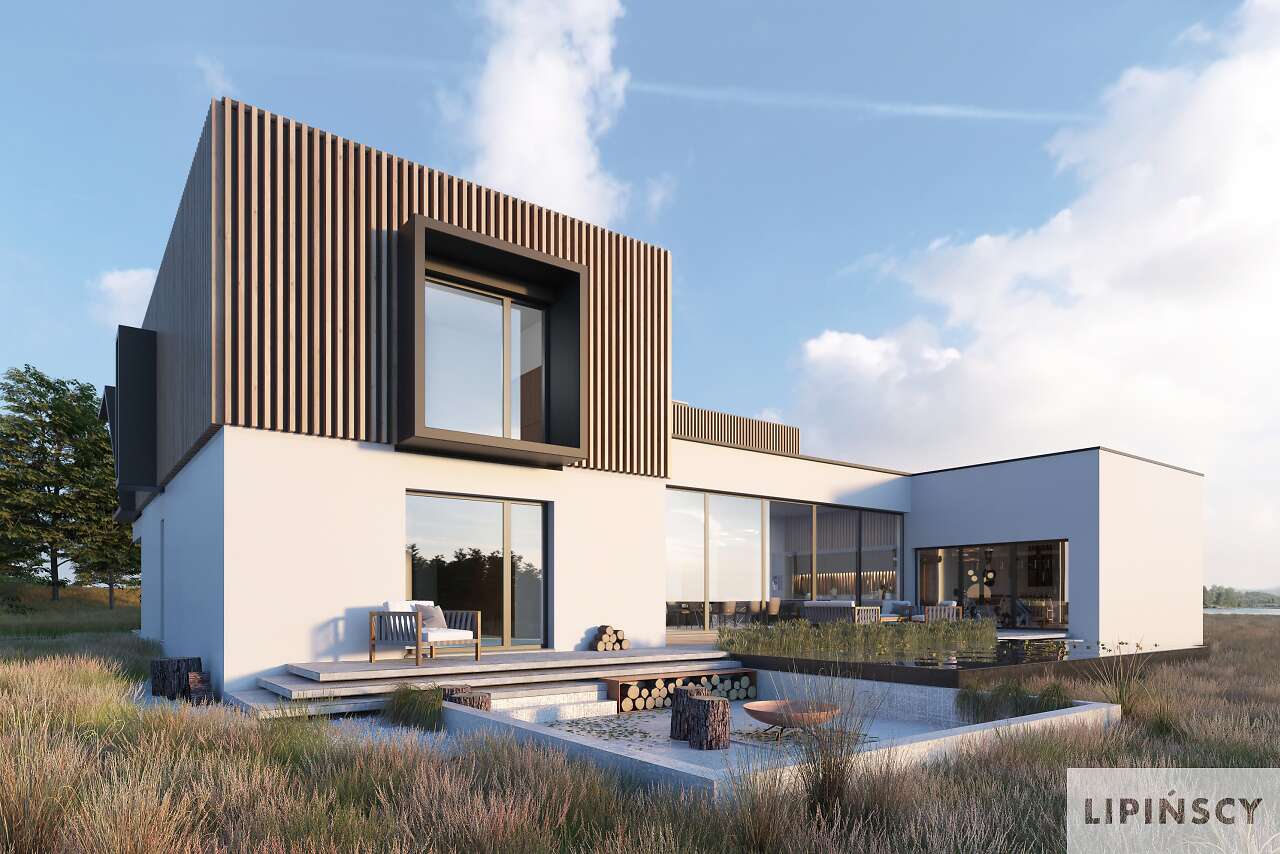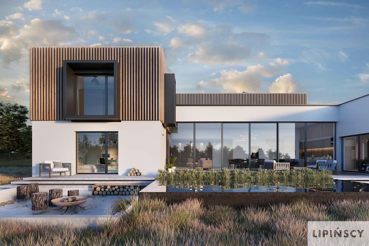 Przepiękny rozłożysty dom z częściowym pietrem wg projektu Annecy to komfortowa propozycja dla wymagających inwestorów. Nietypowa bryła domu z ciekawymi przeszkleniami, mieści bogaty program funkcjonalny. Parter podzielono na 3 części, w tym środkowa to podwyższona otwarta strefa dzienna, a boczne mieszczą z jednej strony dwustanowiskowy garaż, a za nim sporą część rekreacyjną z siłownią, sauną i zapleczem sanitarnym, natomiast po przeciwnej stronie - gabinet i dużą sypialnię małżeńską z łazienką. Piętro to strefa prywatna z czterema sypialniami i dwiema łazienkami.