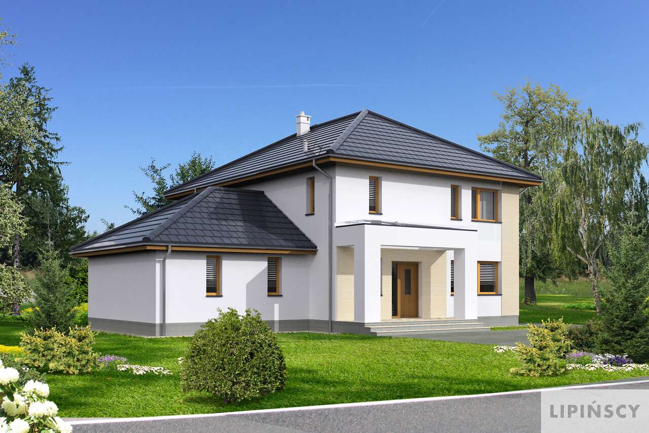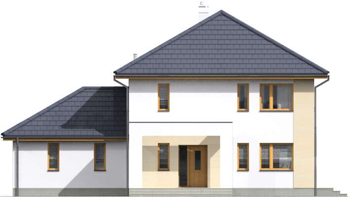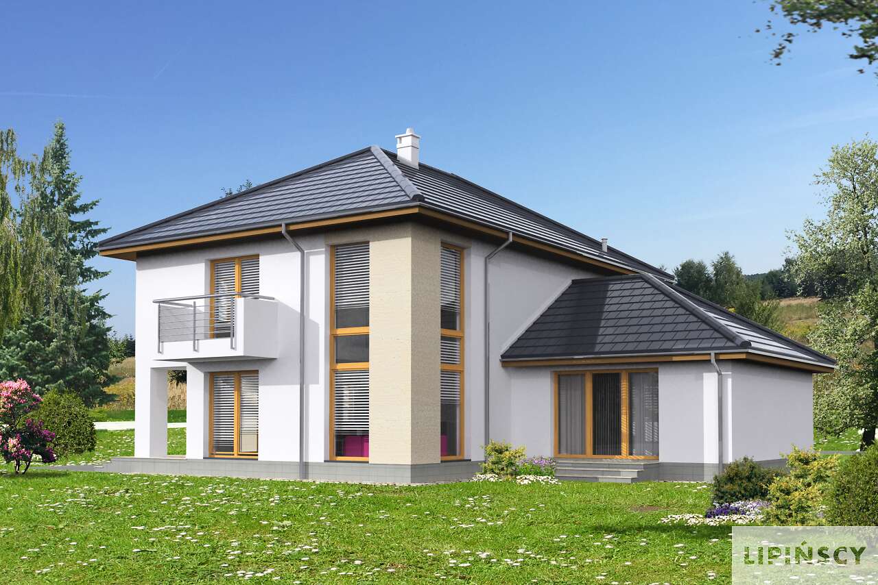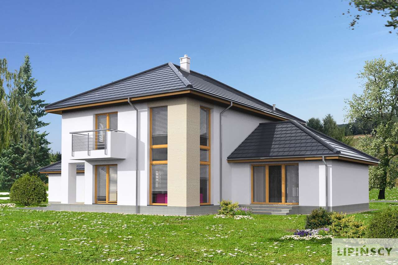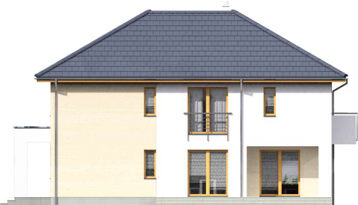 Duży, komfortowy dom piętrowy w standardzie energooszczędnym. Strefa dzienna, na parterze obejmuje kuchnię, jadalnię, przestronny salon i centralnie umieszczone schody. Usytuowana obok kuchni spiżarka to praktyczne rozwiązanie. Po obu stronach od wejścia znajdują się łazienka i spiżarnia. Do bryły domu przylega część z dużym gabinetem i pom. gosp. z piecem gazowym. W strefie nocnej, na poddaszu, są trzy sypialnie, garderoba i łazienka. Do projektu domu można dokupić pasujący stylistycznie projekt garażu G40 o powierzchni niemal 40m².