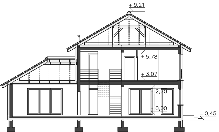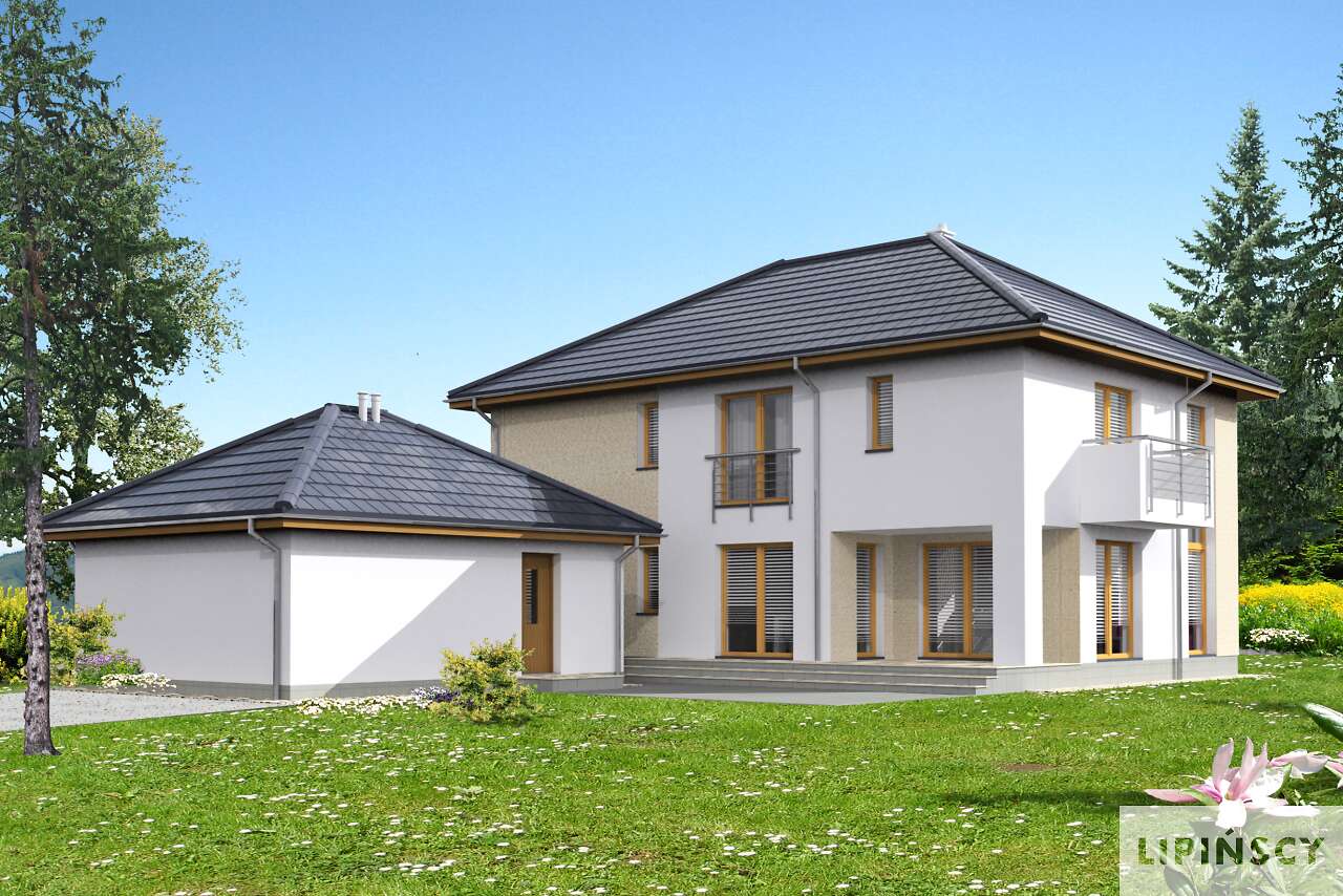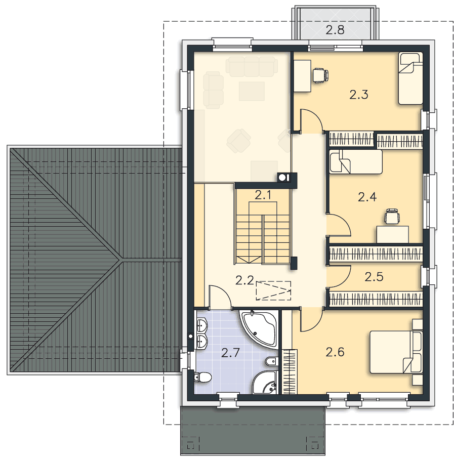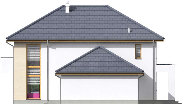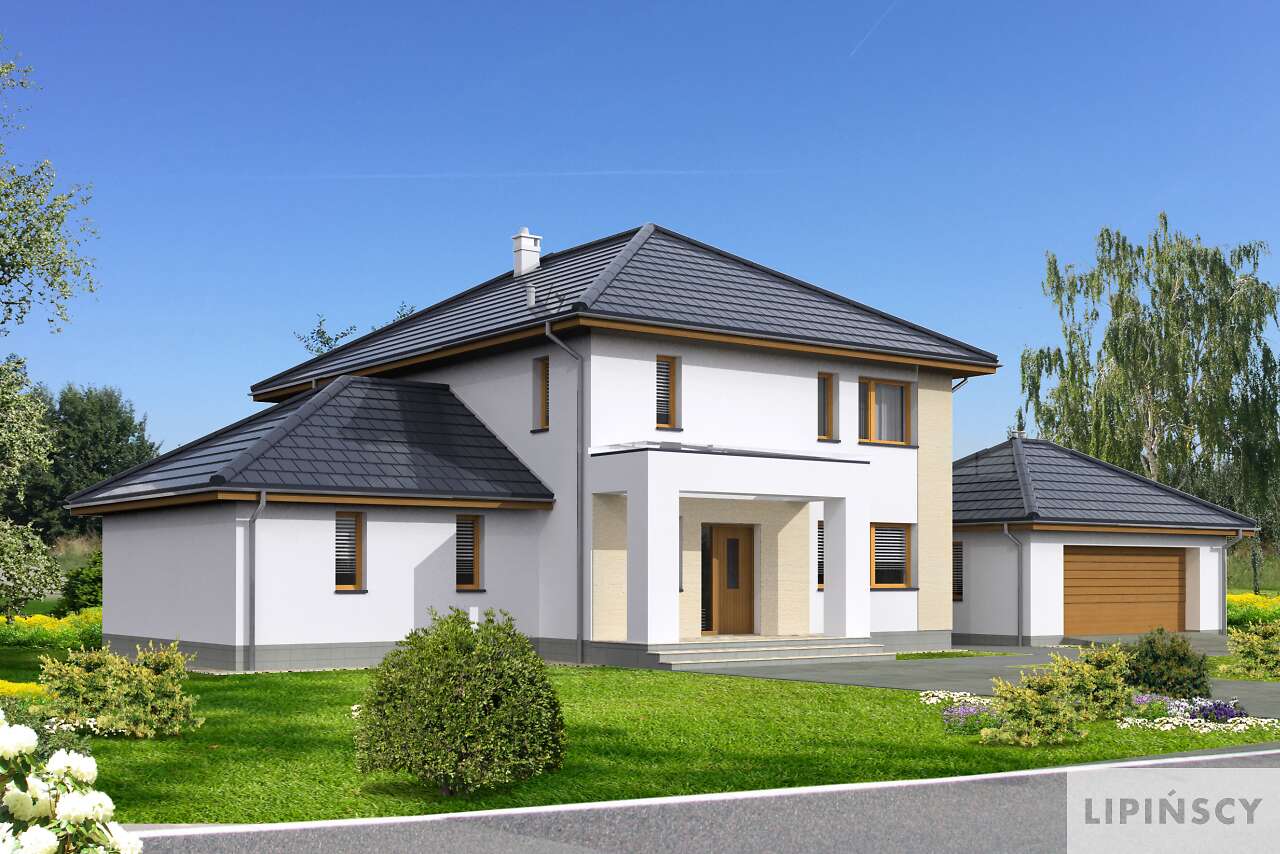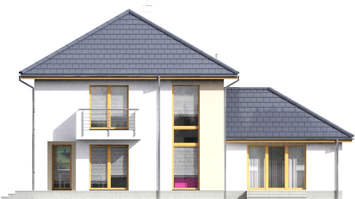 Duży, komfortowy dom piętrowy w standardzie energooszczędnym. Strefa dzienna, na parterze obejmuje kuchnię, jadalnię, przestronny salon i centralnie umieszczone schody. Usytuowana obok kuchni spiżarka to praktyczne rozwiązanie. Po obu stronach od wejścia znajdują się łazienka i spiżarnia. Do bryły domu przylega część z dużym gabinetem i pom. gosp. z piecem gazowym. W strefie nocnej, na poddaszu, są trzy sypialnie, garderoba i łazienka. Do projektu domu można dokupić pasujący stylistycznie projekt garażu G40 o powierzchni niemal 40m².