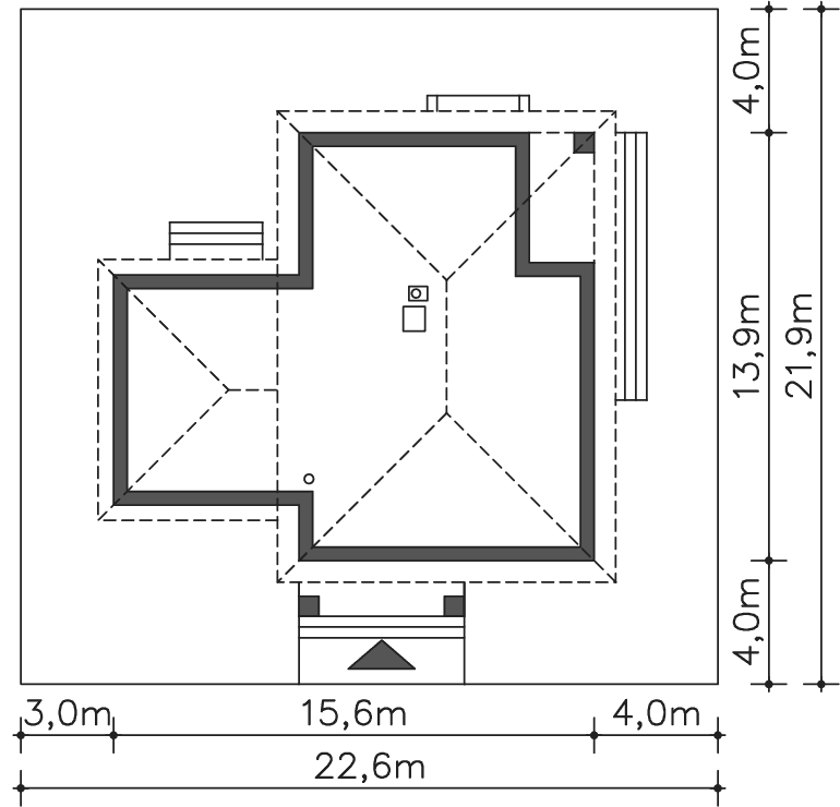 Grafika przedstawia minimalne wymiary działki. Aby sprawdzić, czy dom może być realizowany na konkretnej działce należy uzyskać Wypis i Wyrys z Miejscowego Planu Zagospodarowania Przestrzennego lub jeśli na danym terenie nie ma planu – Decyzję o warunkach zabudowy. Wszystkie projekty wymagają adaptacji do warunków miejscowych przez projektanta lokalnego.