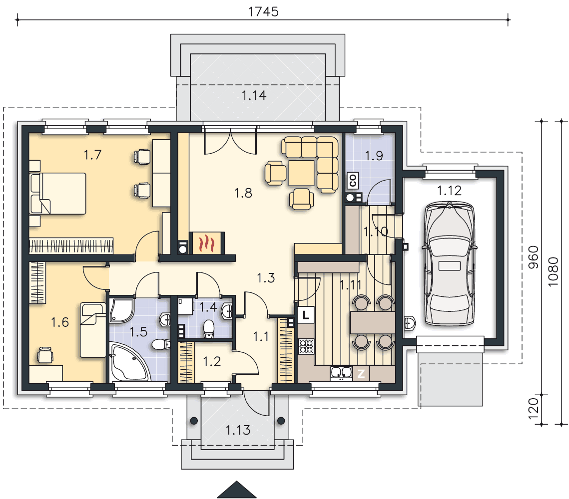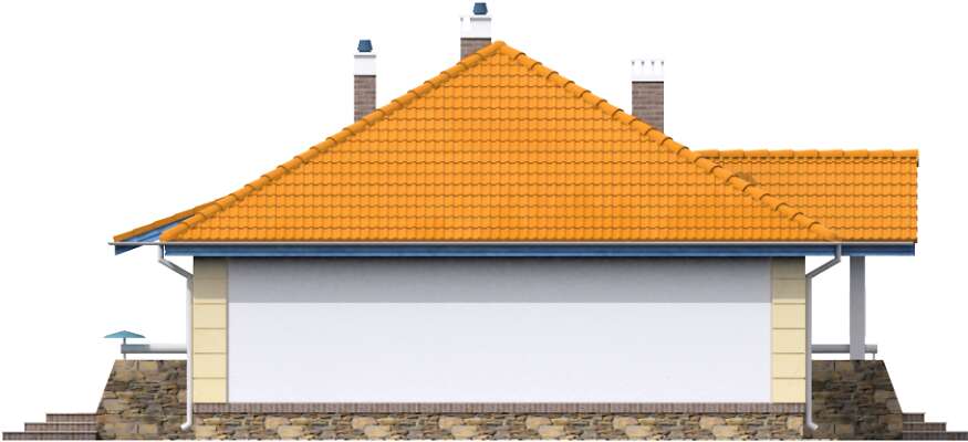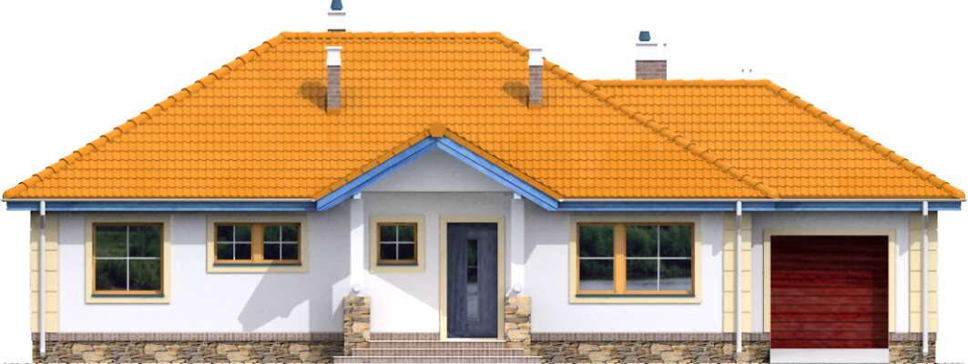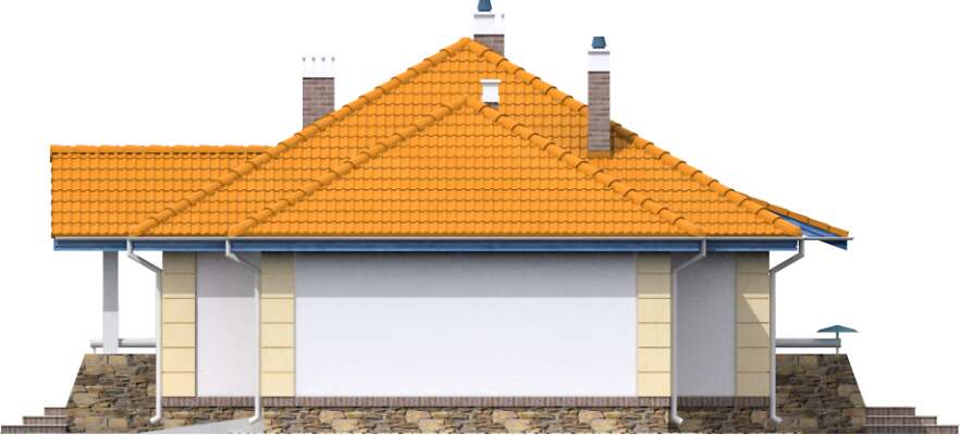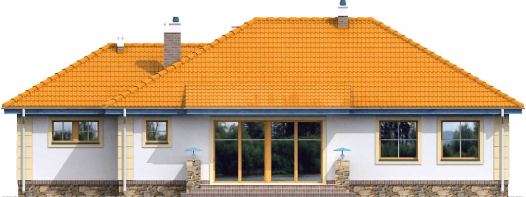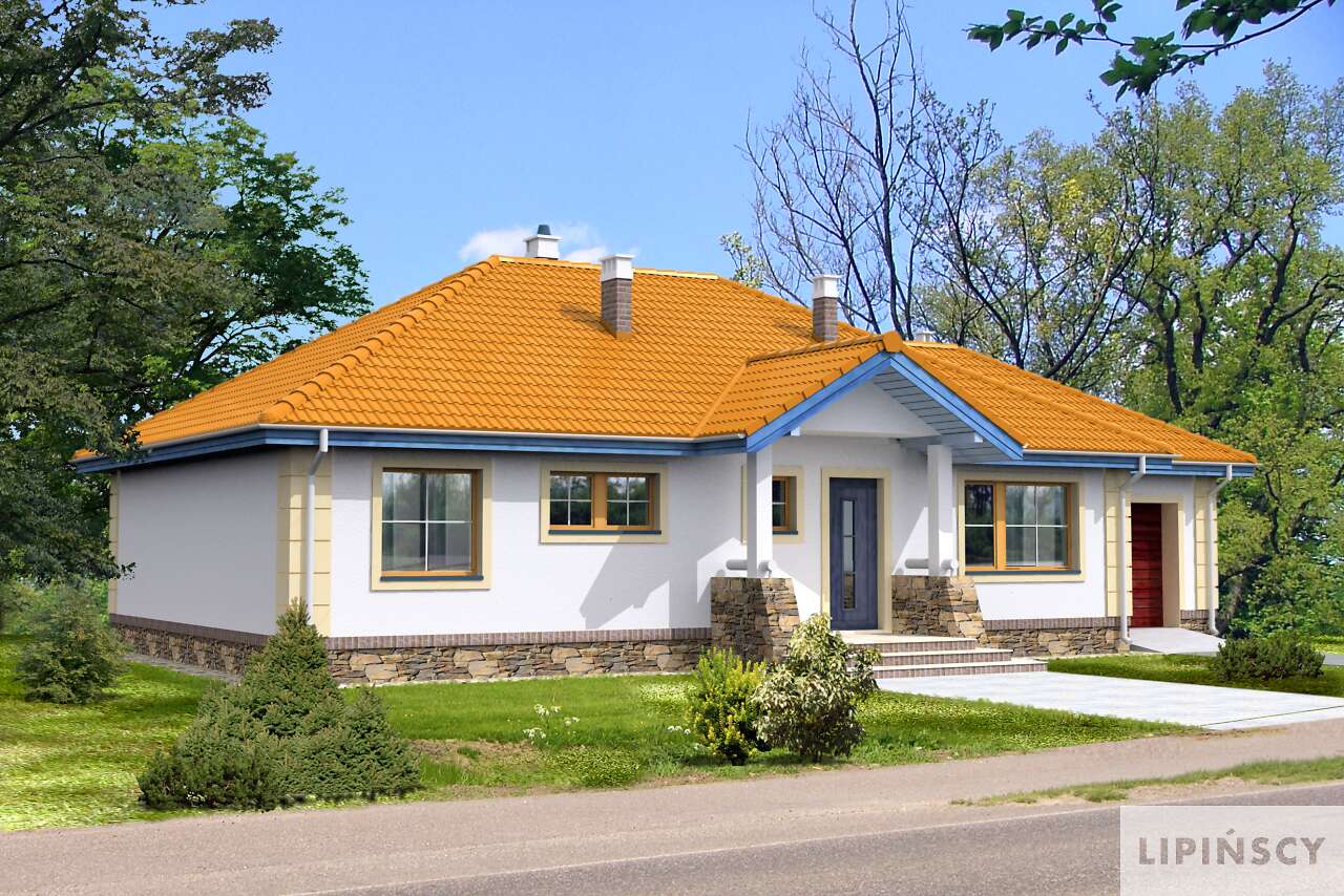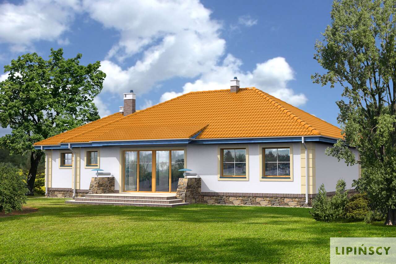 Funkcjonalny dom parterowy, idealny dla niewielkiej rodziny. Do dyspozycji mieszkańców jest obszerny salon z kominkiem, kuchnia ze spiżarnią, pomieszczenie gospodarcze, duża łazienka, wc i dwie sypialnie. Od strony elewacji ogrodowej zlokalizowano zadaszony taras, który, dzięki dużym przeszkleniom w salonie, stanowi niemal część pokoju dziennego. Do budynku należy garaż na jedno auto. Prosta bryła i konstrukcja sprawiają, że dom jest niedrogi w realizacji.