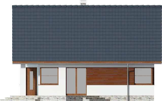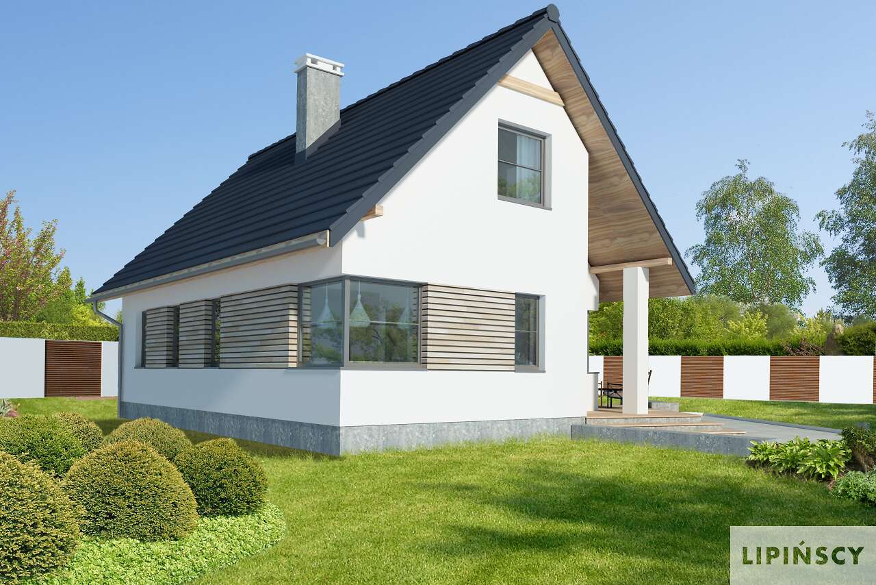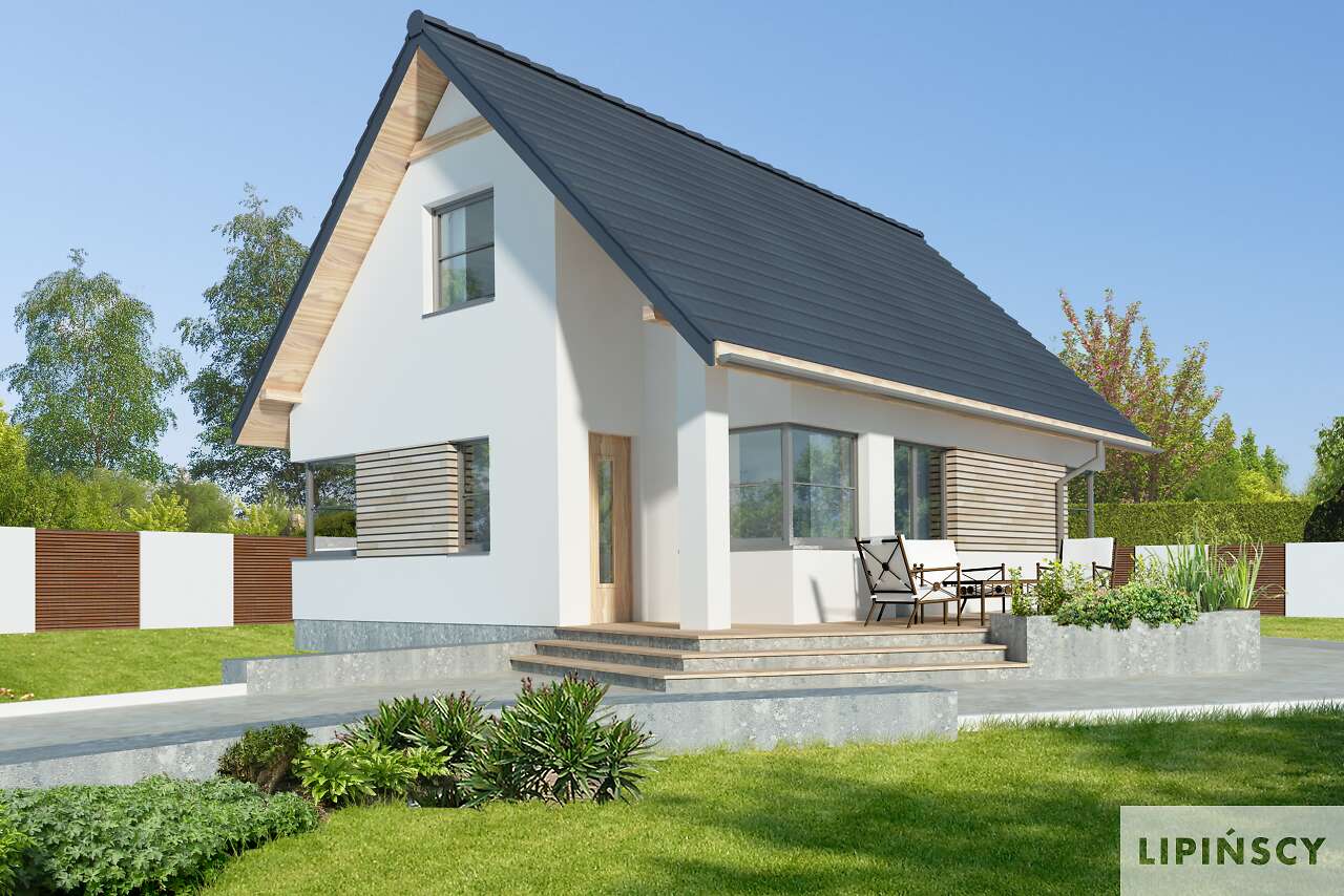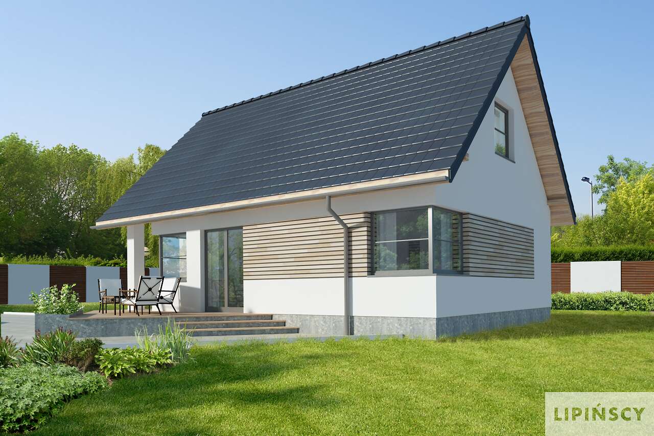 Nieduży, prosty dom z użytkowym poddaszem o nowoczesnym rysie – to dobra propozycja dla inwestorów szukających lokum prostego i taniego w budowie, niedrogiego w użytkowaniu, a przy tym wygodnego i nadającego się na niewielkie działki. Układ funkcjonalny jest idealny dla pary, która na co dzień może użytkować parter, gdzie znajduje się salon z częścią rekreacyjną i jadalnianą, kuchnia, spiżarnia, łazienka, wc oraz sypialnia z garderobą. Zlokalizowane w salonie schody mogą stanowić ciekawy element aranżacyjny wnętrza i prowadzą na poddasze, które można wykorzystać jako część gościnną dla odwiedzających dzieci, czy przestrzeń do pracy. Proporcjonalna bryła domu – dzięki jasnej elewacji z elementami drewna, jest elegancka i nowoczesna.