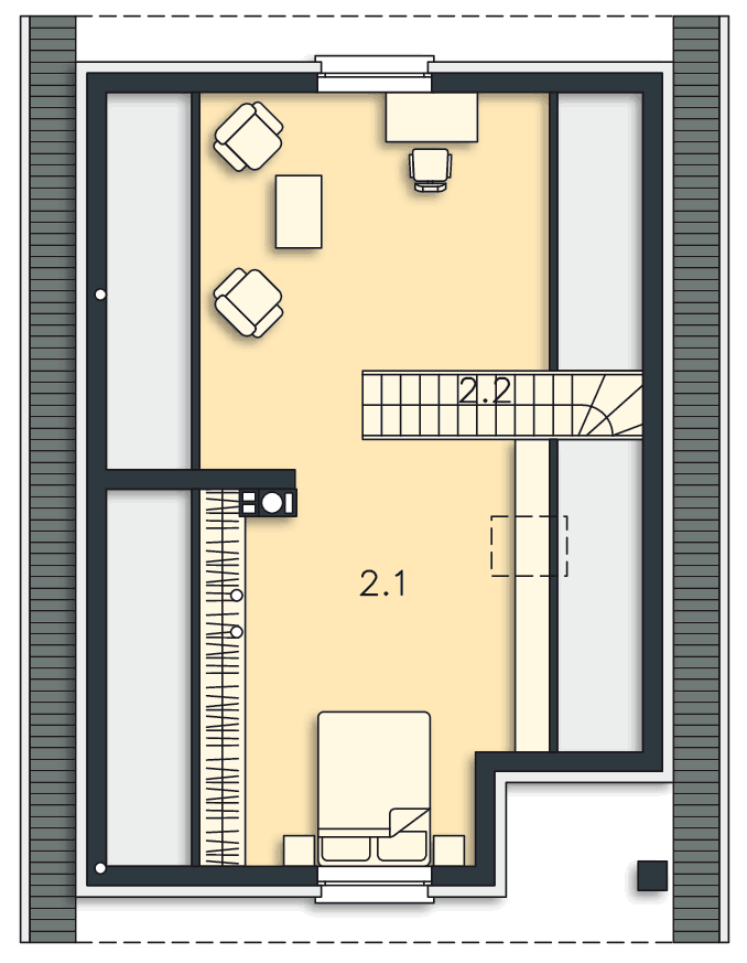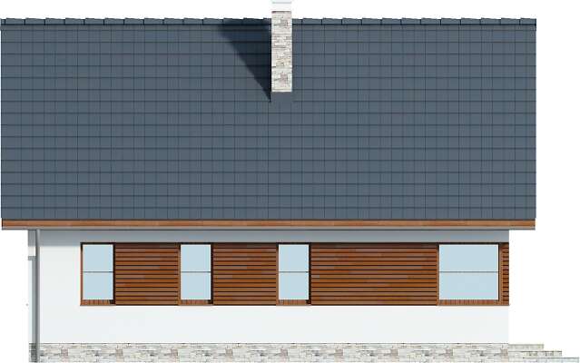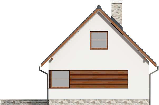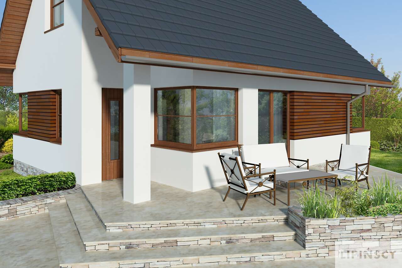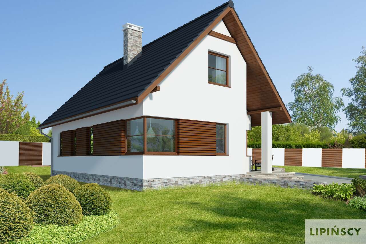 Nieduży, prosty dom z użytkowym poddaszem o nowoczesnym rysie – to dobra propozycja dla inwestorów szukających lokum prostego i taniego w budowie, niedrogiego w użytkowaniu, a przy tym wygodnego i nadającego się na niewielkie działki. Układ funkcjonalny jest idealny dla pary, która na co dzień może użytkować parter, gdzie znajduje się salon z częścią rekreacyjną i jadalnianą, kuchnia, spiżarnia, łazienka, wc oraz sypialnia z garderobą. Zlokalizowane w salonie schody mogą stanowić ciekawy element aranżacyjny wnętrza i prowadzą na poddasze, które można wykorzystać jako część gościnną dla odwiedzających dzieci, czy przestrzeń do pracy. Proporcjonalna bryła domu – dzięki jasnej elewacji z elementami drewna, jest elegancka i nowoczesna.