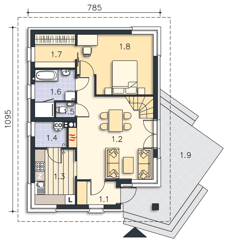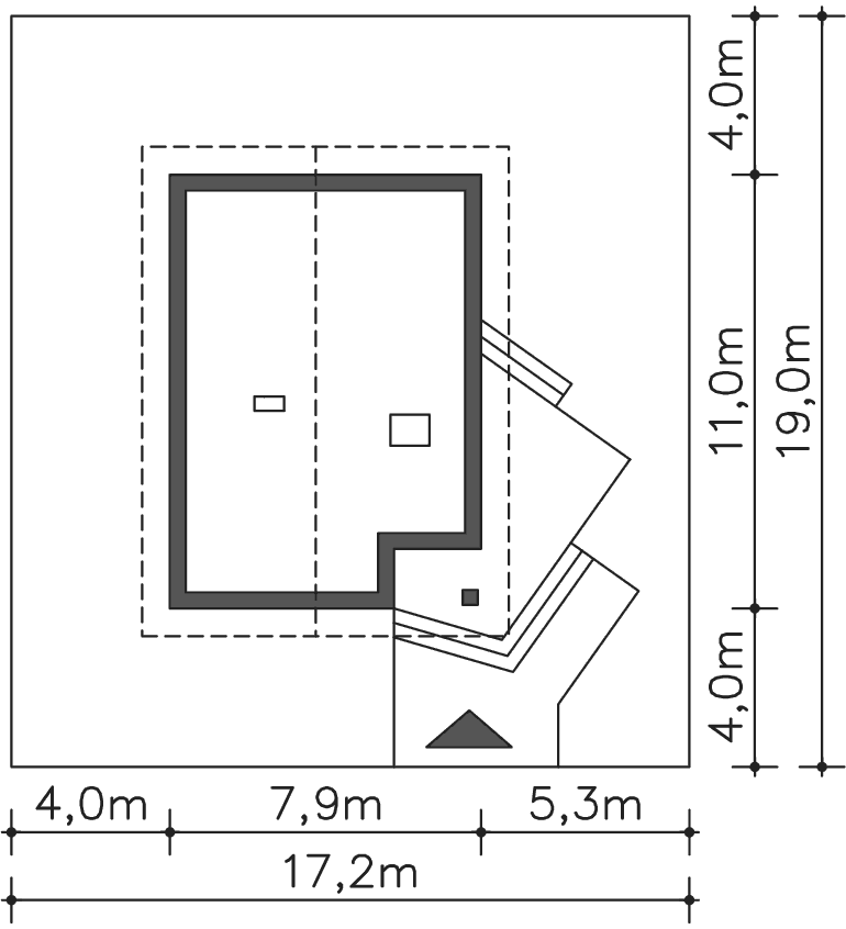 Grafika przedstawia minimalne wymiary działki. Aby sprawdzić, czy dom może być realizowany na konkretnej działce należy uzyskać Wypis i Wyrys z Miejscowego Planu Zagospodarowania Przestrzennego lub jeśli na danym terenie nie ma planu – Decyzję o warunkach zabudowy. Wszystkie projekty wymagają adaptacji do warunków miejscowych przez projektanta lokalnego.
