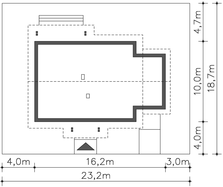 Grafika przedstawia minimalne wymiary działki. Aby sprawdzić, czy dom może być realizowany na konkretnej działce należy uzyskać Wypis i Wyrys z Miejscowego Planu Zagospodarowania Przestrzennego lub jeśli na danym terenie nie ma planu – Decyzję o warunkach zabudowy. Wszystkie projekty wymagają adaptacji do warunków miejscowych przez projektanta lokalnego.