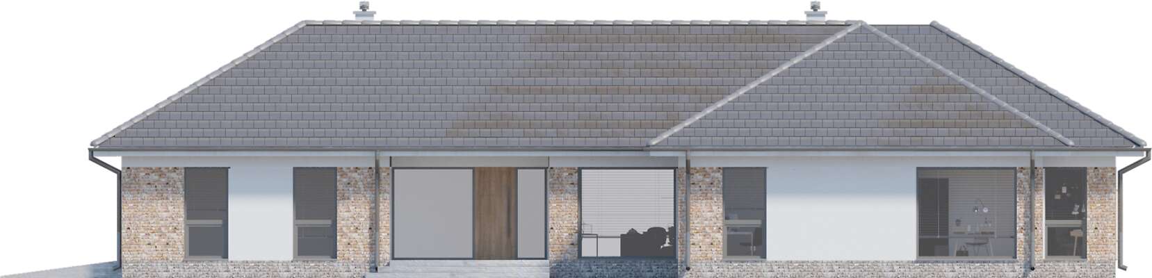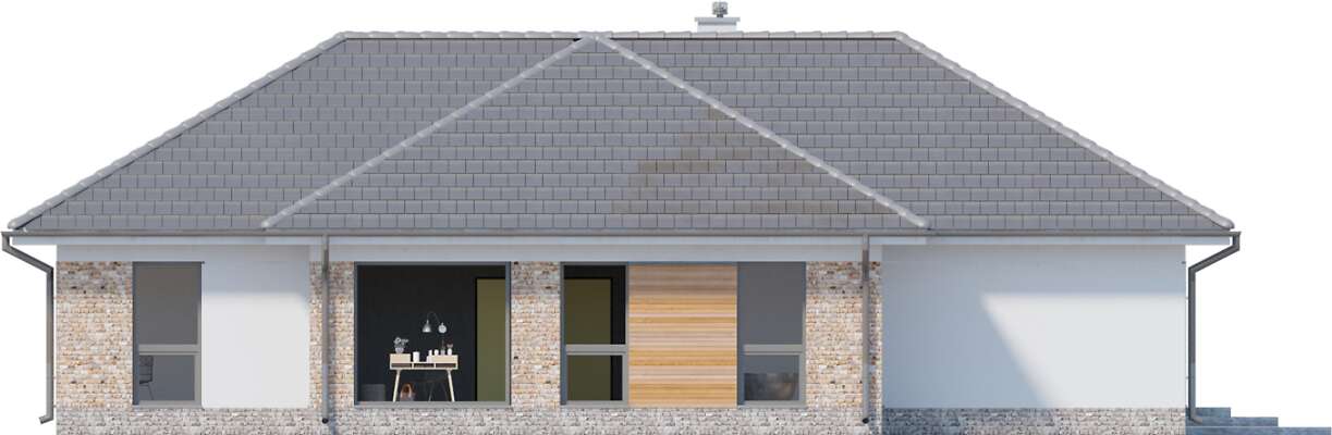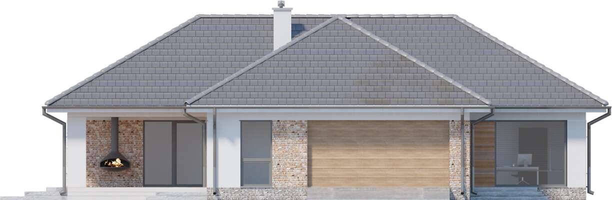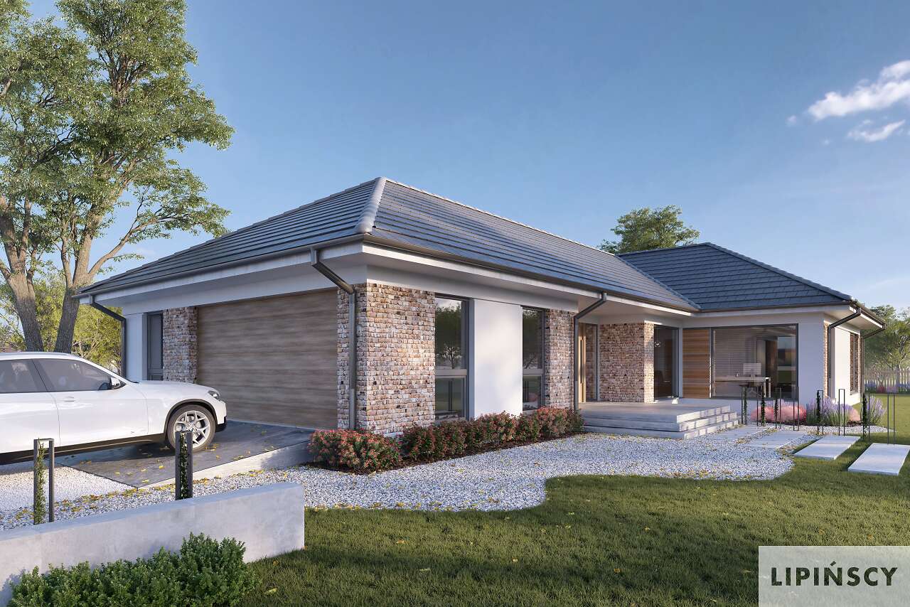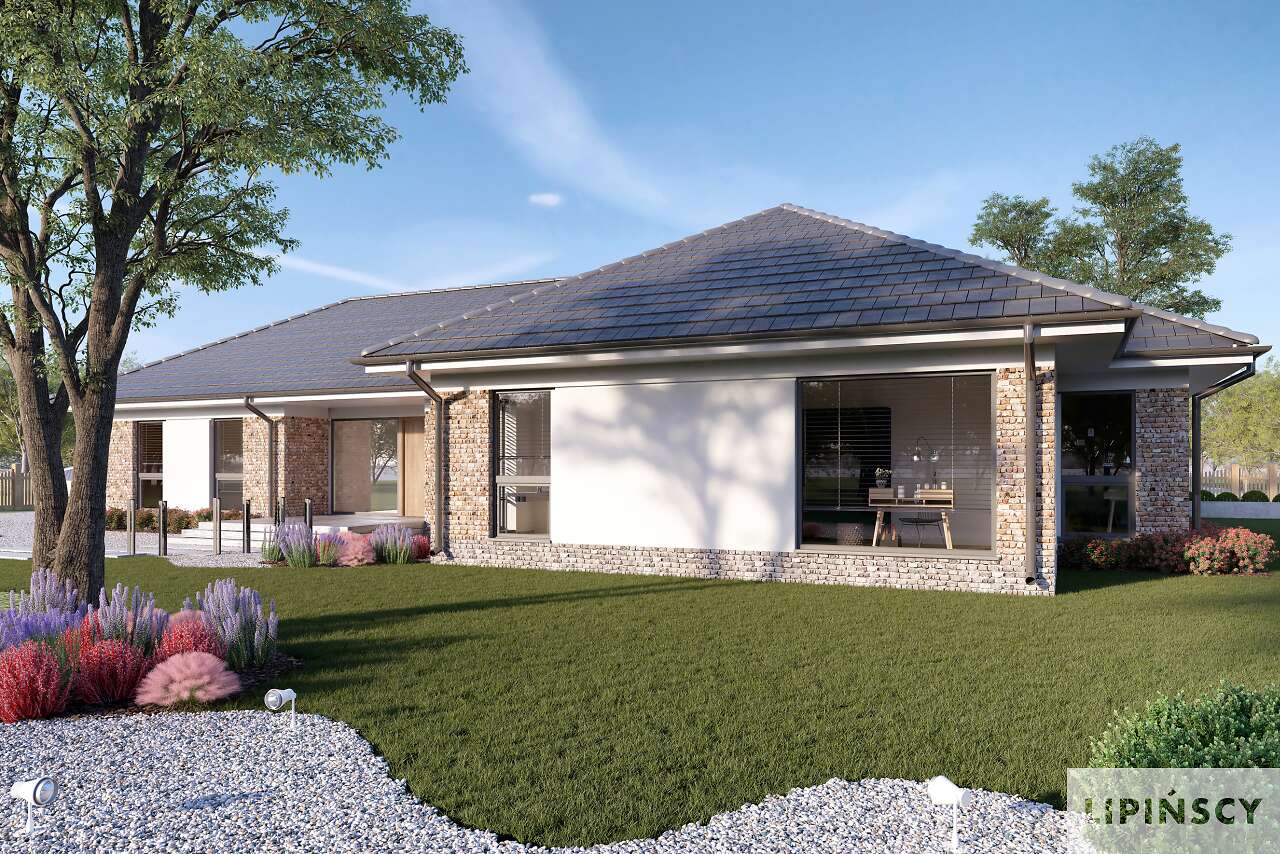 Wygodny energooszczędny dom parterowy z dachem wielospadowym. Układ budynku pozwala zlokalizować go na niezbyt szerokiej działce oraz na działkach o różnym usytuowaniu wobec stron świata. Wyodrębniono trzy strefy: gospodarczą z podwójnym garażem i pomieszczeniami dodatkowymi, doskonale doświetloną strefę rekreacyjną z półotwartą kuchnią z wyspą, zadaszonym tarasem usytuowanym w narożu między dwoma ścianami i posiadającym zewnętrzny kominek- w centralnej części domu oraz część prywatną z przeszklonymi czterema sypialniami i dwoma łazienkami. Cegła na elewacji domowi nadaje wyrazistego charakteru, a przytulności - otoczeniu domu, a płaska dachówka podkreśla nowoczesny charakter architektury. W projekcie przewidziano ogrzewanie kotłem na gaz. Możliwa jest zmiana ogrzewania na pompę ciepła.