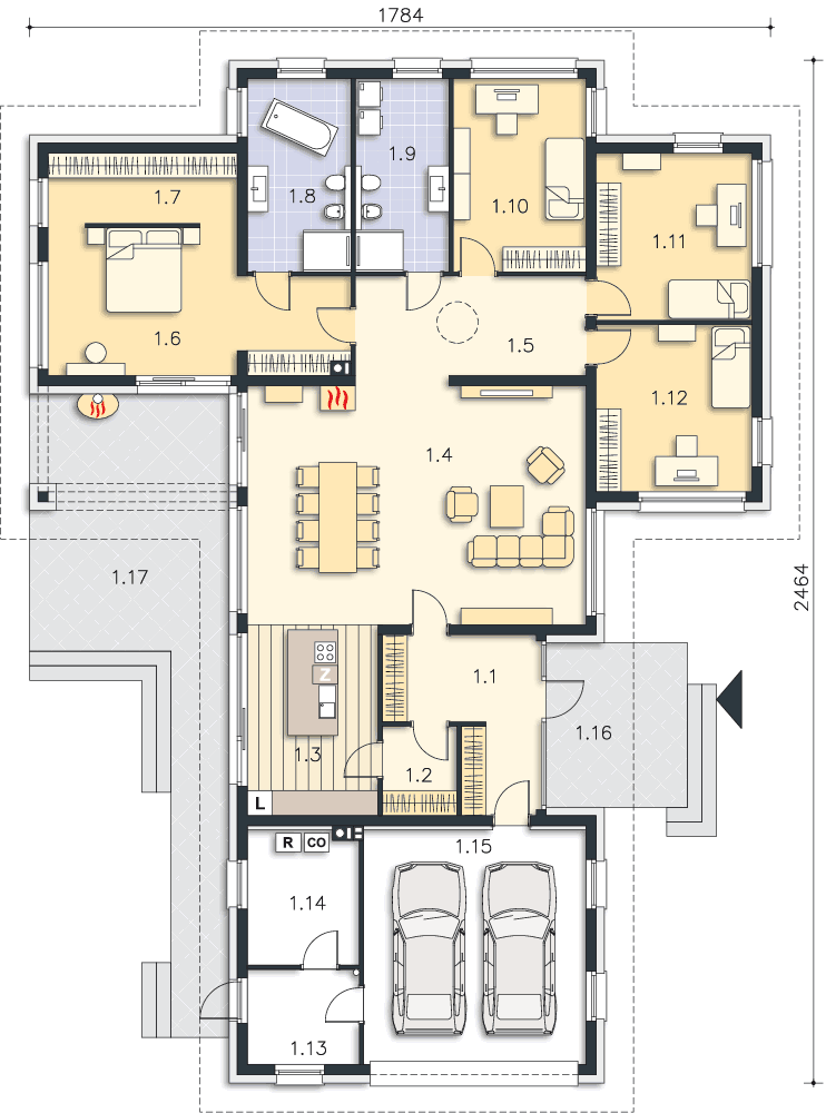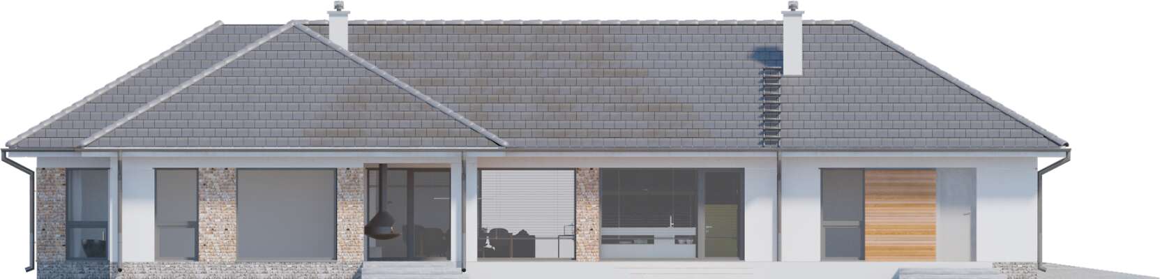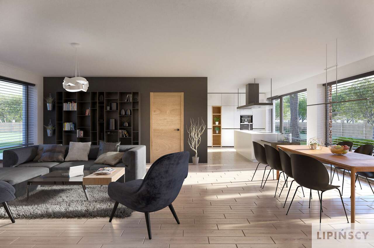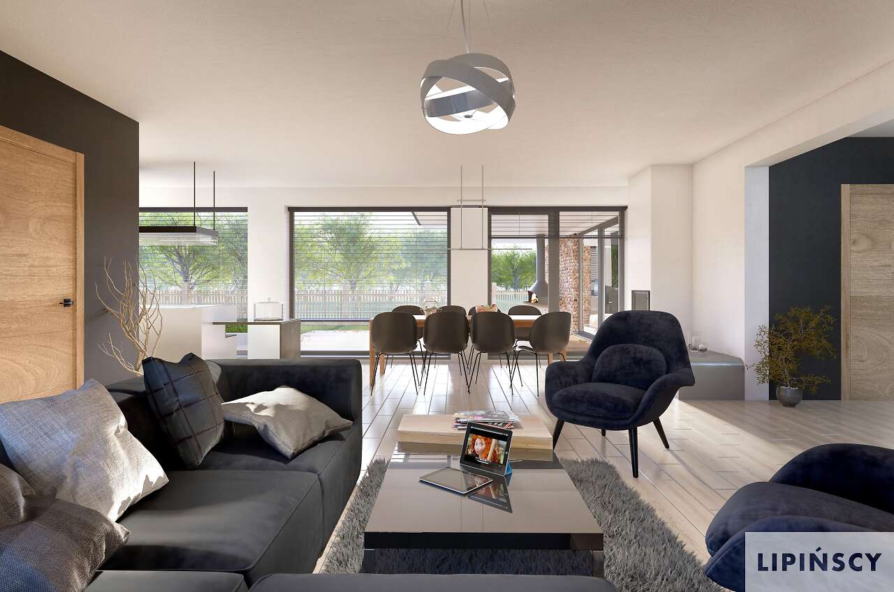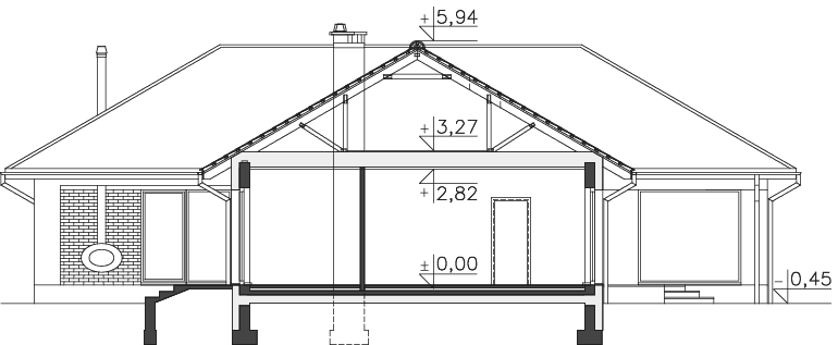 Wygodny energooszczędny dom parterowy z dachem wielospadowym. Układ budynku pozwala zlokalizować go na niezbyt szerokiej działce oraz na działkach o różnym usytuowaniu wobec stron świata. Wyodrębniono trzy strefy: gospodarczą z podwójnym garażem i pomieszczeniami dodatkowymi, doskonale doświetloną strefę rekreacyjną z półotwartą kuchnią z wyspą, zadaszonym tarasem usytuowanym w narożu między dwoma ścianami i posiadającym zewnętrzny kominek- w centralnej części domu oraz część prywatną z przeszklonymi czterema sypialniami i dwoma łazienkami. Cegła na elewacji domowi nadaje wyrazistego charakteru, a przytulności - otoczeniu domu, a płaska dachówka podkreśla nowoczesny charakter architektury. W projekcie przewidziano ogrzewanie kotłem na gaz. Możliwa jest zmiana ogrzewania na pompę ciepła.