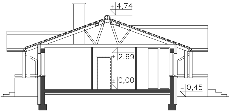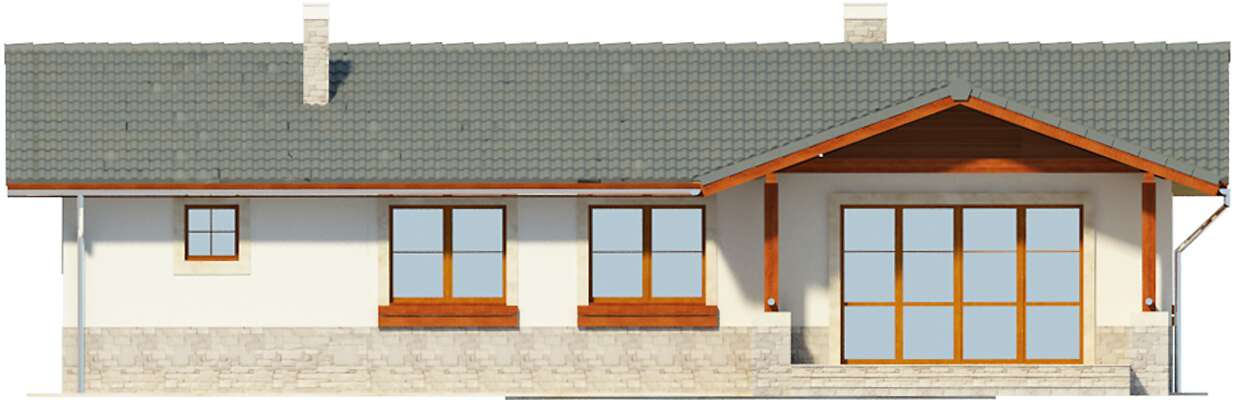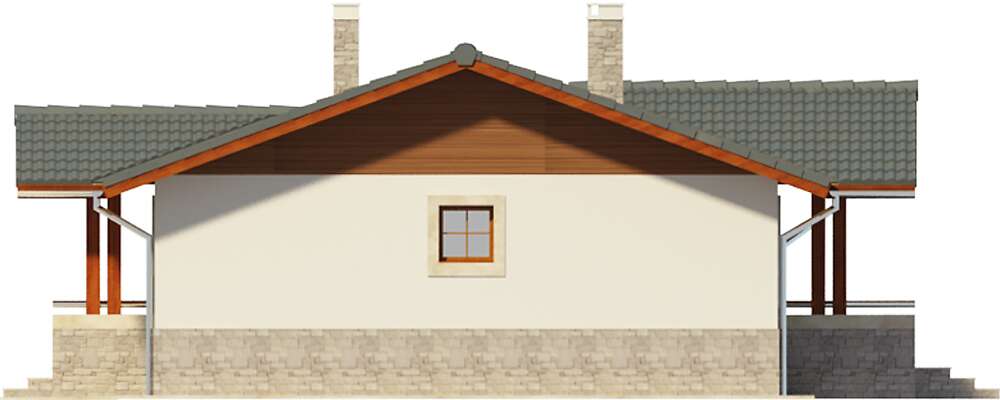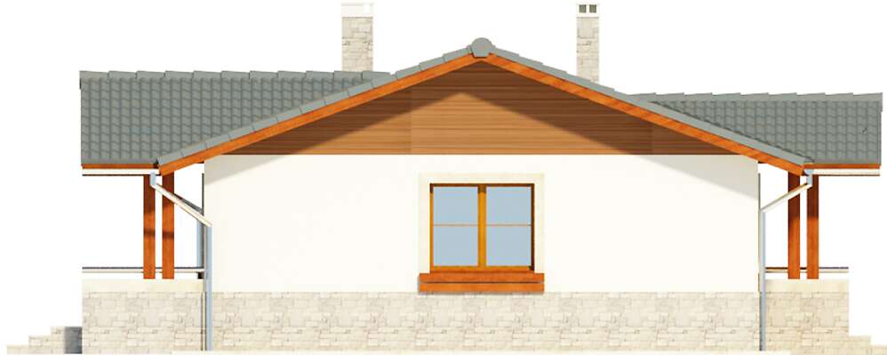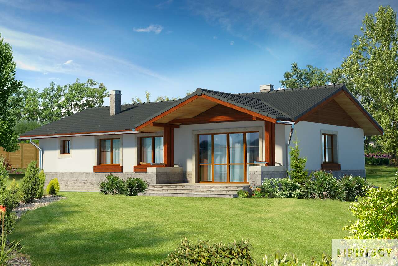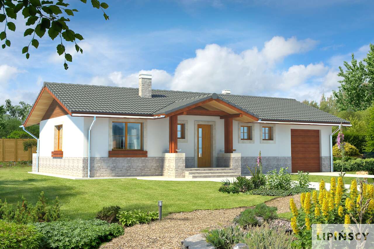 Niewielki, zgrabny domek parterowy z dwuspadowym dachem i zadaszeniami nad wejściem i tarasem. Oprócz wygodnej strefy dziennej zaplanowano dwie sypialnie i dużą łazienkę oraz kilka pomieszczeń pomocniczych. Z domu można przejść bezpośrednio do garażu, poprzez niewielki schowek. Za garażem znajduje się osobna kotłownia, która może być także zaadaptowana na piec na paliwo stałe. Pomieszczenie przy wejściu może natomiast pełnić rolę spiżarni.