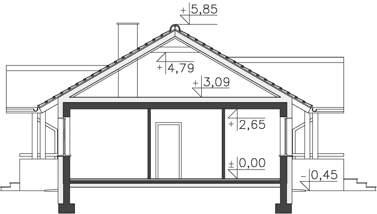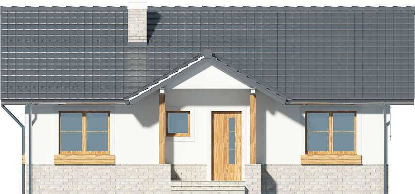 Prosty w budowie i niedrogi w wykonaniu dom parterowy, z dachem dwuspadowym o kącie nachylenia 30 stopni, z ciekawie zaaranżowanym wejściem i częściowo zadaszonym tarasem. Na około 80m² zlokalizowano salon z przeszklonym wyjściem na taras, półotwartą, funkcjonalną kuchnię, dużą łazienkę oknem, sypialnię z własną garderobą oraz dodatkowy pokój. W zlokalizowanej przy wejściu kotłowni znajduje się kocioł gazowy oraz wejście na strych, który można wykorzystać w celach gospodarczych. Tradycyjny wygląd domu przypadnie do gustu inwestorom, planującym budowę na terenach podmiejskich lub na działkach wiejskich.