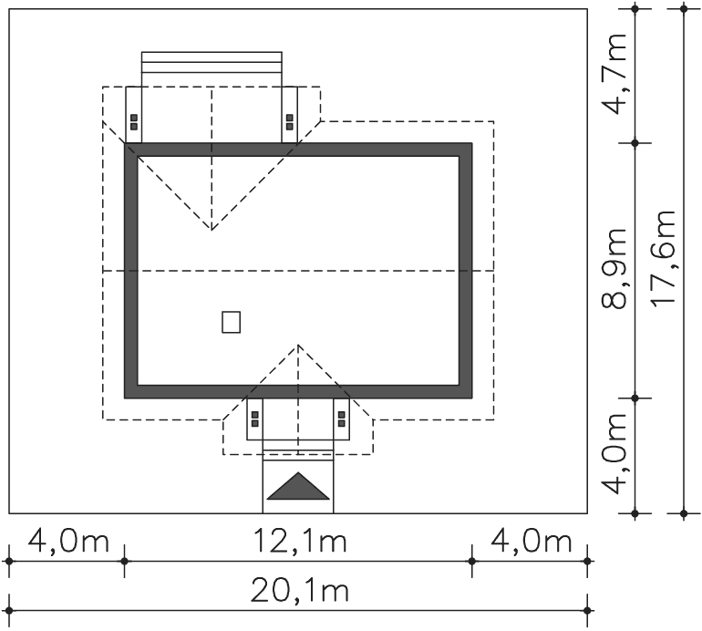 Grafika przedstawia minimalne wymiary działki. Aby sprawdzić, czy dom może być realizowany na konkretnej działce należy uzyskać Wypis i Wyrys z Miejscowego Planu Zagospodarowania Przestrzennego lub jeśli na danym terenie nie ma planu – Decyzję o warunkach zabudowy. Wszystkie projekty wymagają adaptacji do warunków miejscowych przez projektanta lokalnego.