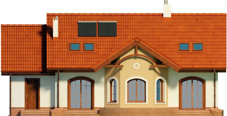 Świetny domek, bardzo mi się podoba ten projekt. Proszę o poszerzenie gamy projektów o takim dworkowo-wiejskim charakterze z prostym rozkładem wnętrz, dużymi salonem z kominkiem na dole oraz pomieszczeniami typu kuchnia, kotłownia, łazienka, pracownia (gabinet) spiżarnia a na górze sypialnie łazienka garderoba. Okiennice i wejście z filarkami świetna sprawa, dodaje uroku. tył budynku z wyjściem na ogród - świetny wygląd i nawet wykusz, który często jest kulą u nogi ze względu na kłopoty z prawidłowym wykonaniem (szczelnym) przez wykonawcę w tym wypadku jest do zaakceptowania. Nawet powiedziałbym że bez tego wykuszu nie byłoby takiego efektu. Oczywiście powinien być w okładzinie elewacyjnej z klinkieru lub płytek elewacyjnych. Kotłownia na paliwo stałe z miejscem na opał i osobnym wejściem musi być koniecznie. Okna z łukami również świetna sprawa, bardzo nam przypadł do gustu. Jeszcze nie wiem ale się dowiem jak sprawa z kosztami budowy, energoszczędnością i zakwalifikowaniem do programu RODZINA NA SWOIM, choć przy tych gabarytach (pow. użytkowej) RNS będzie raczej niekorzystny. Co do szczegółów jeszcze się nie zagłębiłem w projekt. Na razie opinia estetyczna.