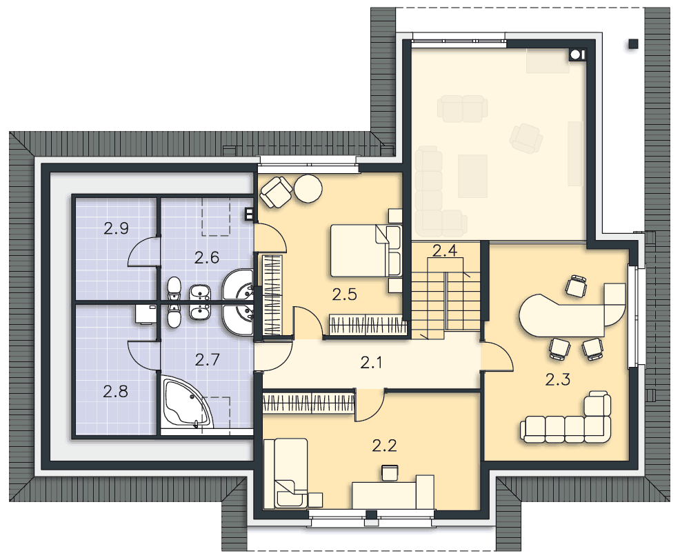 Bardzo interesujący projekt. Podoba mi się ilość światła w pomieszczeniach jednak zastanawiam się czy można dodatkowo umieścić okno dachowe w pomieszczeniu 2.3?