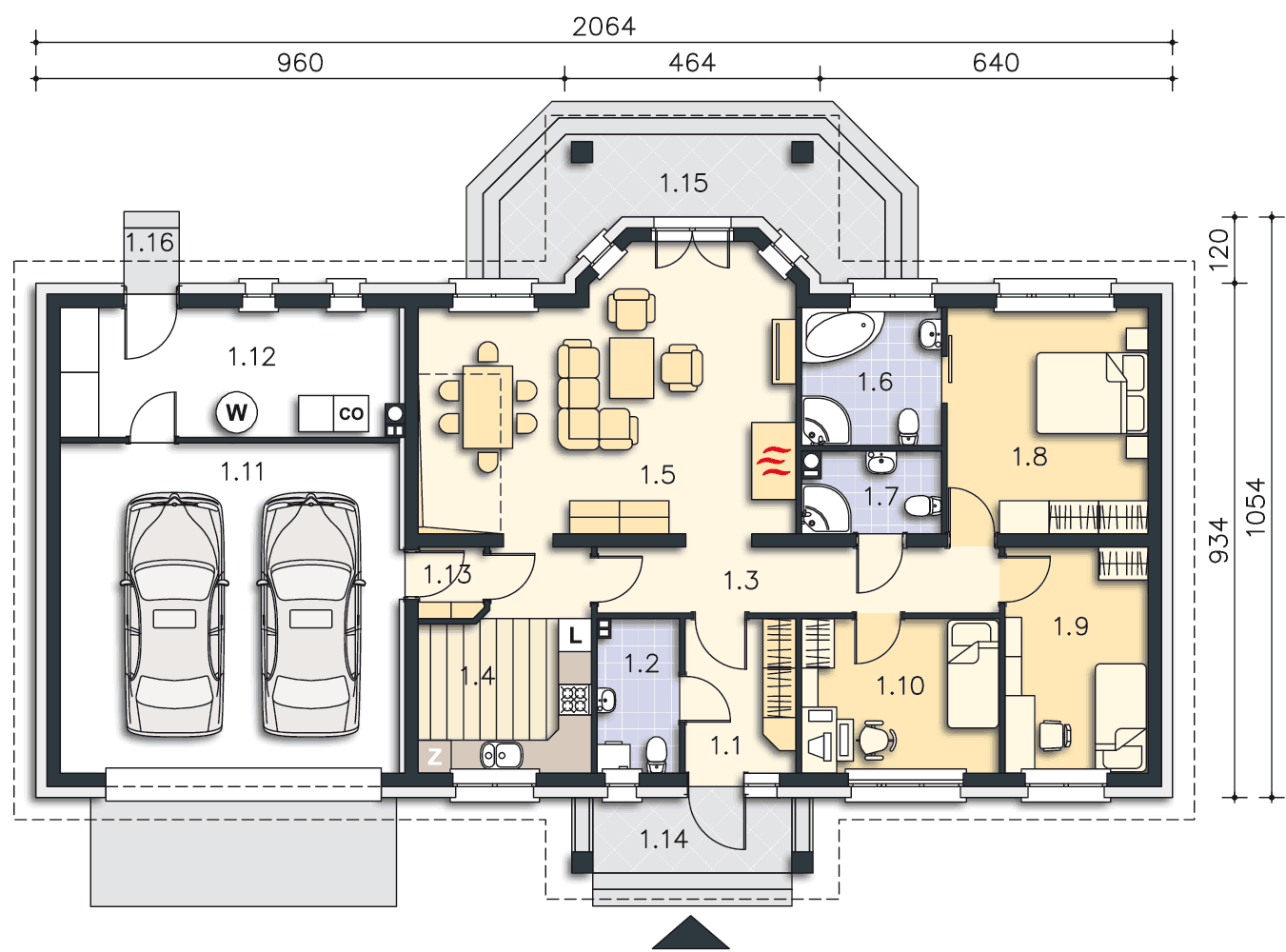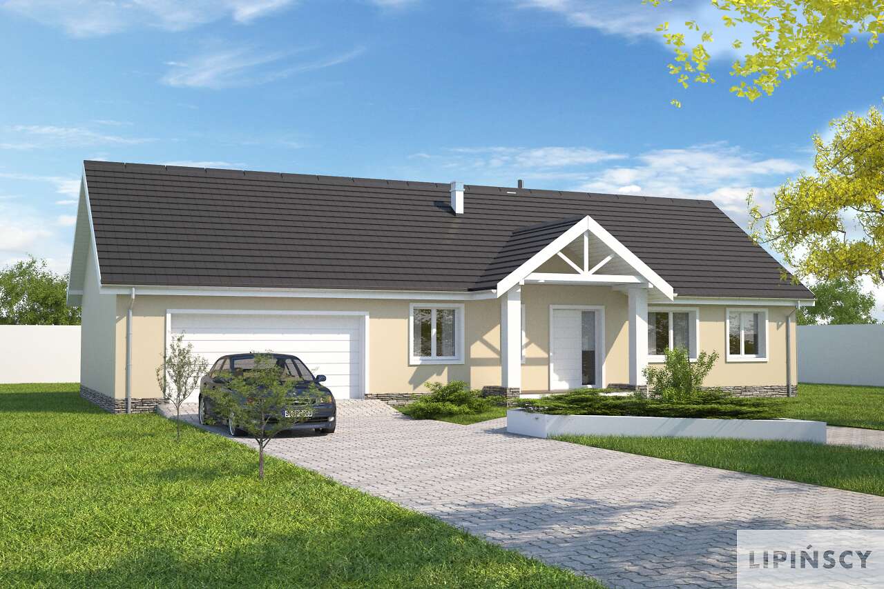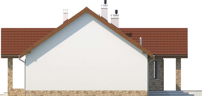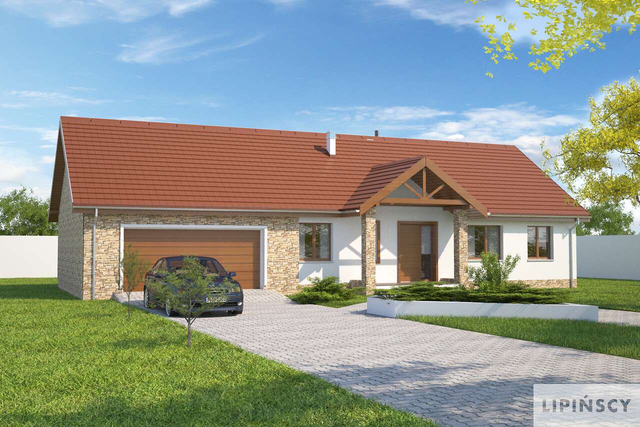 Awinion w wersji z dwustanowiskowym garażem i dwuspadowym dachem to przestronny dom energooszczędny o wygodnym układzie pomieszczeń. Duży salon jest urozmaicony wykuszem, z którego można wyjść na zadaszony taras. Z części kuchni wydzielono praktyczną spiżarnię, która jest jednocześnie przejściem do garażu. Za garażem znajduje się duża kotłownia, w której można zastosować piec na paliwo stałe.