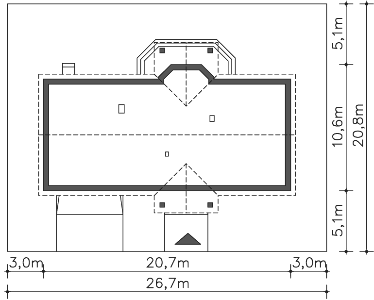 Grafika przedstawia minimalne wymiary działki. Aby sprawdzić, czy dom może być realizowany na konkretnej działce należy uzyskać Wypis i Wyrys z Miejscowego Planu Zagospodarowania Przestrzennego lub jeśli na danym terenie nie ma planu – Decyzję o warunkach zabudowy. Wszystkie projekty wymagają adaptacji do warunków miejscowych przez projektanta lokalnego.