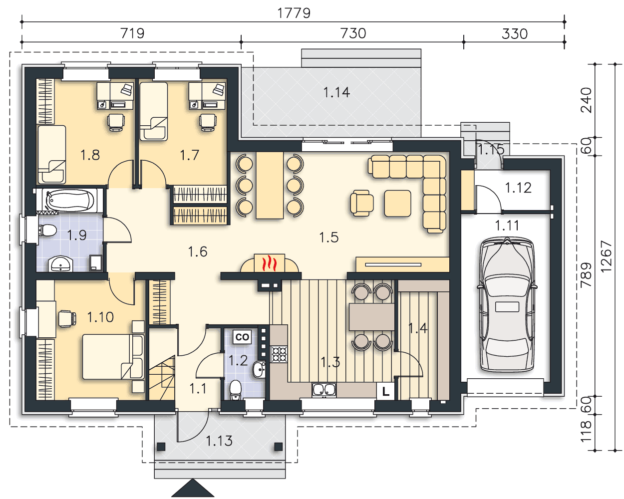 - kotłownię mamy za garażem w pomieszczenie 1.12.
