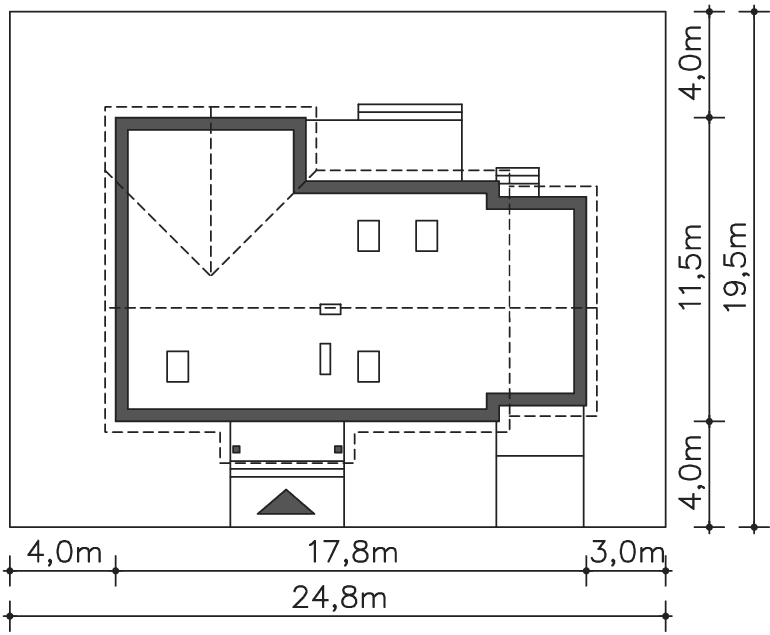 Grafika przedstawia minimalne wymiary działki. Aby sprawdzić, czy dom może być realizowany na konkretnej działce należy uzyskać Wypis i Wyrys z Miejscowego Planu Zagospodarowania Przestrzennego lub jeśli na danym terenie nie ma planu – Decyzję o warunkach zabudowy. Wszystkie projekty wymagają adaptacji do warunków miejscowych przez projektanta lokalnego.