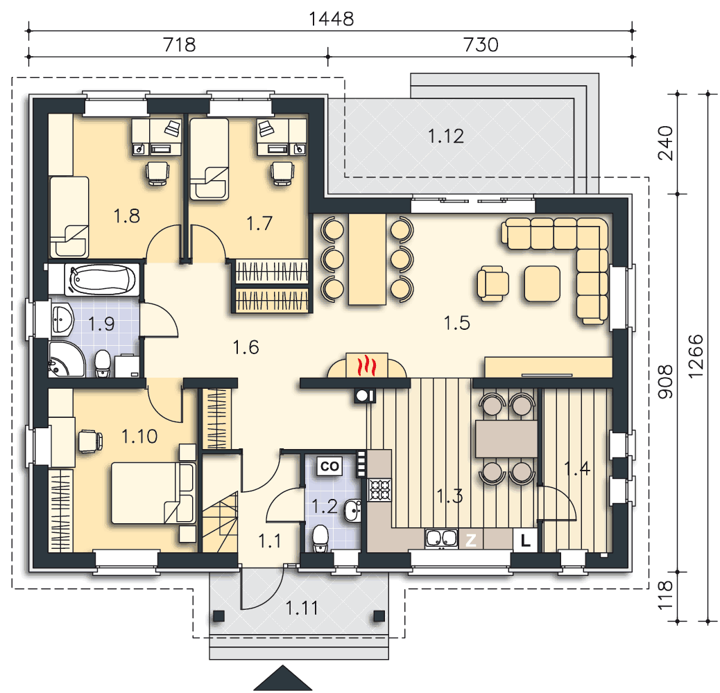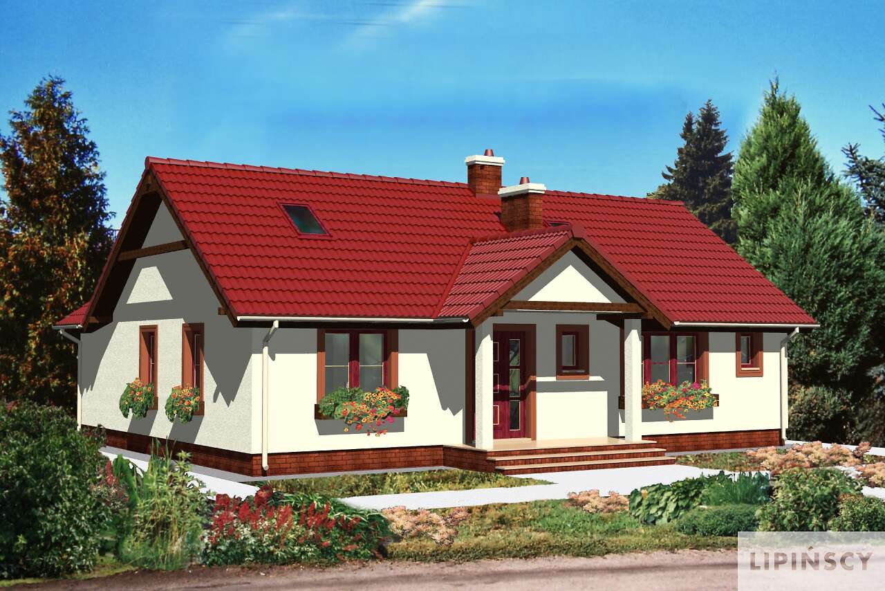 Jest to parterowy dom z możliwością wykorzystania ok. 40m² powierzchni strychowej. Na parterze wyraźnie wyodrębniono strefy dzienną i nocną. Strefa dzienna to salon z kominkiem oraz kuchnia z aneksem jadalnym. W bezpośrednim sąsiedztwie kuchni zlokalizowano pomieszczenie gospodarcze mogące pełnić rolę np. spiżarni. Część nocna domu to trzy sypialnie i łazienka. Parter zamieszkiwać może wygodnie czteroosobowa rodzina. Poddasze dostępne jest poprzez schody przy wejściu. Umożliwia to rozszerzenie programu funkcjonalnego domu o np. jednoprzestrzenną pracownię. Dostępna jest wersja projektu z garażem.