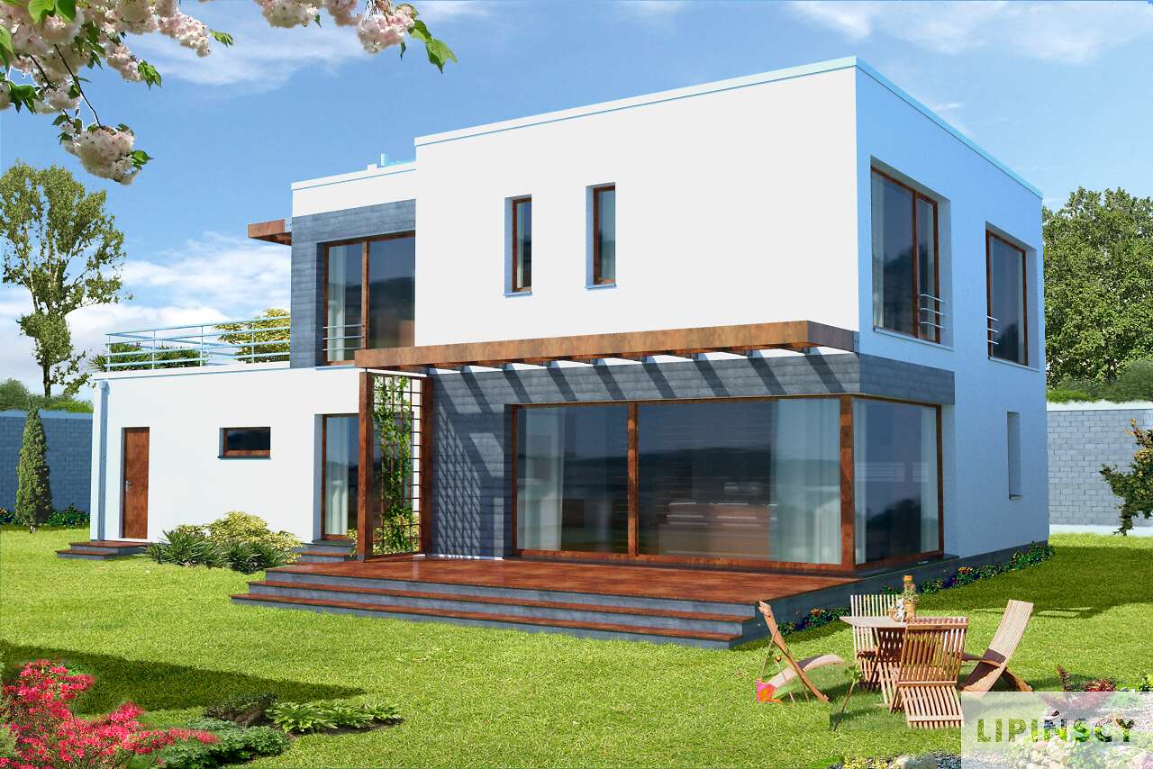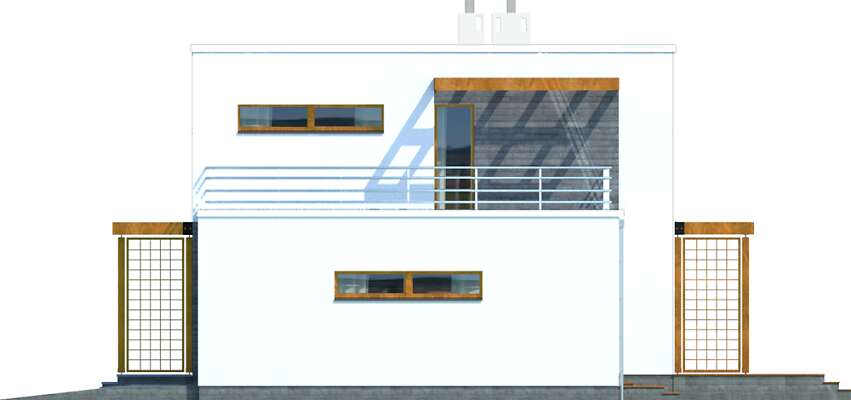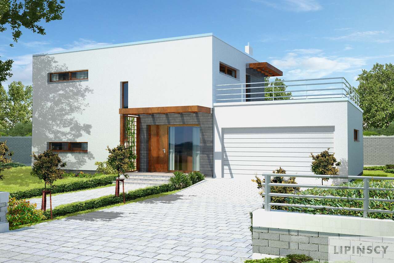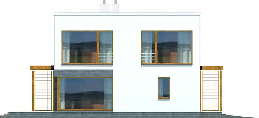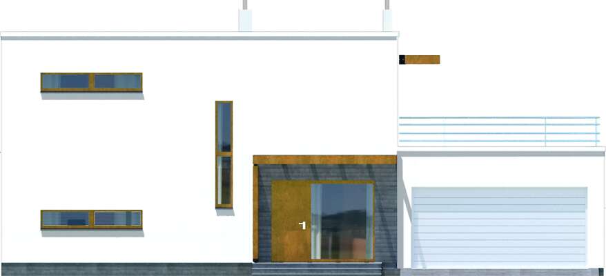 Nowoczesny dom energooszczędny, którego bryła zwraca uwagę płaskim dachem i dużymi przeszkleniami, dzięki czemu zyskuje on swój indywidualny charakter. Doskonała propozycja dla inwestorów ceniących niebanalny wygląd i komfort mieszkania. Na parterze znajduje się duży salon graniczący z kuchnią, spiżarnia, gabinet i łazienka. Piętro to strefa prywatna z trzema sypialniami, w tym jedna z własną łazienką i garderobą, komfortowa łazienka i duży taras. W bryłę budynku wkomponowano dwustanowiskowy garaż, a za nim kotłownię i pomieszczenie gospodarcze.