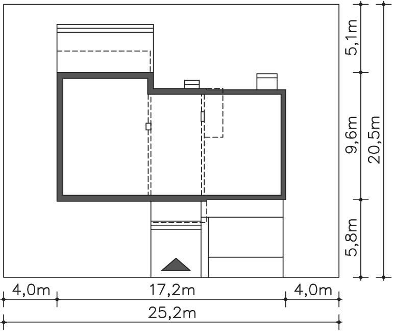 Grafika przedstawia minimalne wymiary działki. Aby sprawdzić, czy dom może być realizowany na konkretnej działce należy uzyskać Wypis i Wyrys z Miejscowego Planu Zagospodarowania Przestrzennego lub jeśli na danym terenie nie ma planu – Decyzję o warunkach zabudowy. Wszystkie projekty wymagają adaptacji do warunków miejscowych przez projektanta lokalnego.