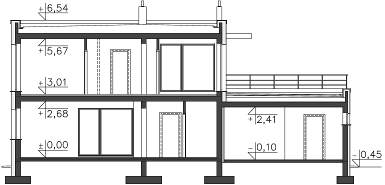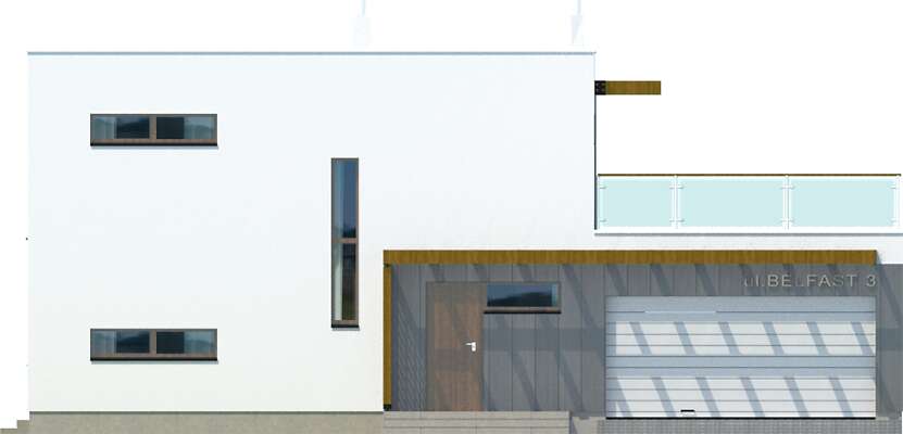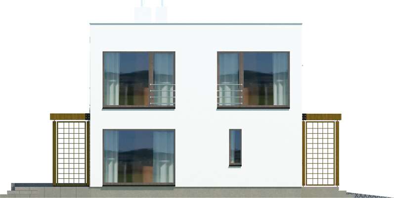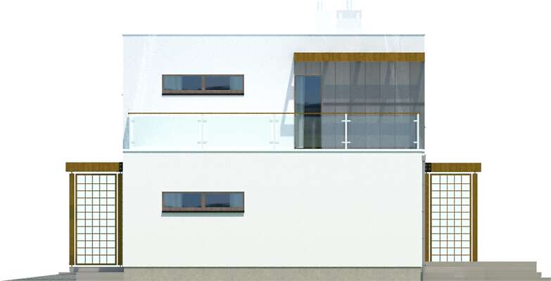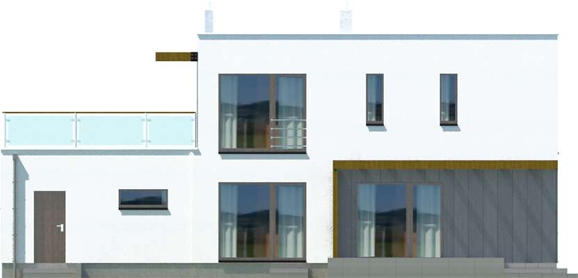Nowoczesny dom z płaskim dachem, z dużymi przeszkleniami, nadającymi bryle lekkości i elegancji. Funkcjonalne wnętrze – parter i poddasze podzielono na strefę dzienną i nocną. Mieszkańcy mogą wspólnie spędzać czas w połączonym z kuchnią salonie, a gdy chcą nieco spokoju, mają do dyspozycji trzy zlokalizowane na parterze sypialnie. Oprócz tych pomieszczeń, jest do ich dyspozycji także osobna sypialnia na parterze, dwie łazienki, garderoba i duży, nowoczesny taras na dachu garażu.