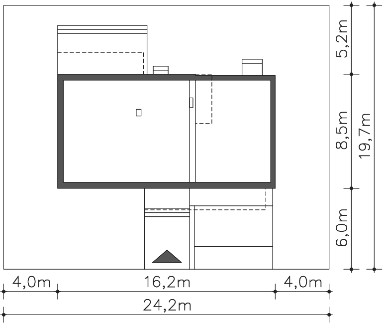 Grafika przedstawia minimalne wymiary działki. Aby sprawdzić, czy dom może być realizowany na konkretnej działce należy uzyskać Wypis i Wyrys z Miejscowego Planu Zagospodarowania Przestrzennego lub jeśli na danym terenie nie ma planu – Decyzję o warunkach zabudowy. Wszystkie projekty wymagają adaptacji do warunków miejscowych przez projektanta lokalnego.