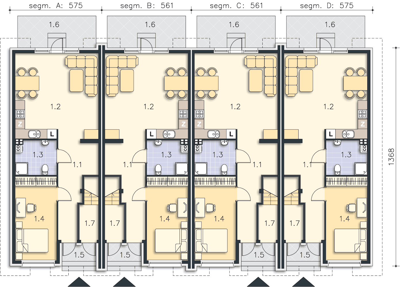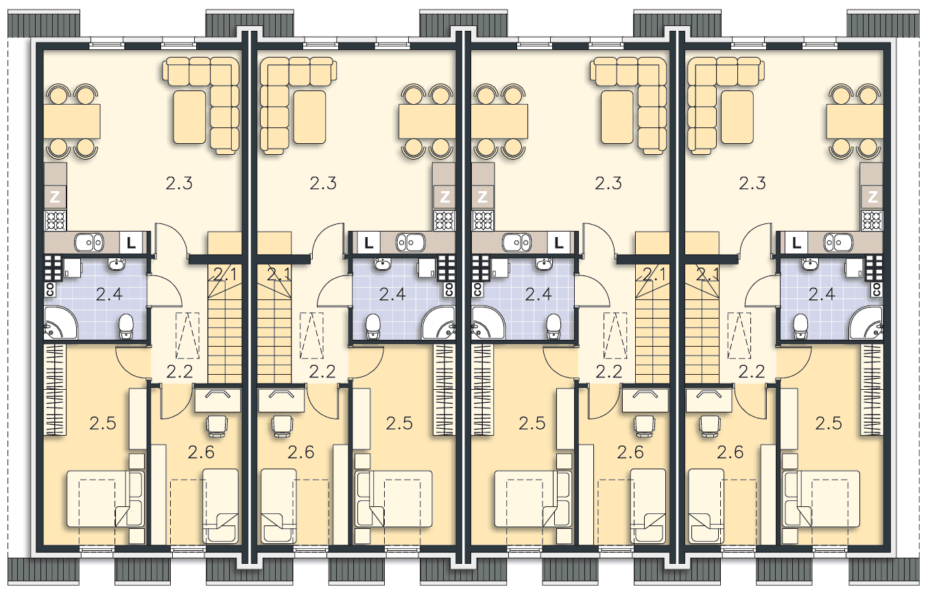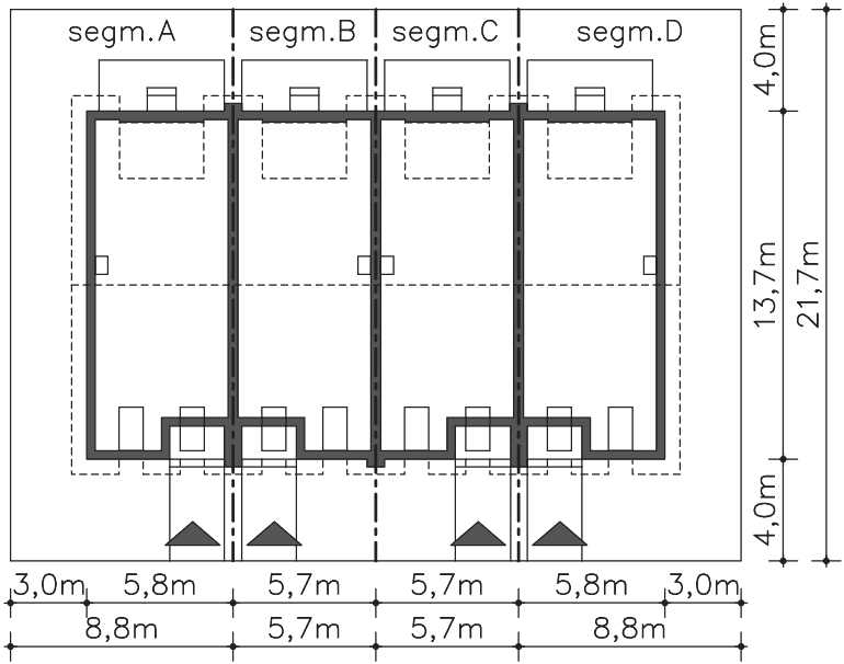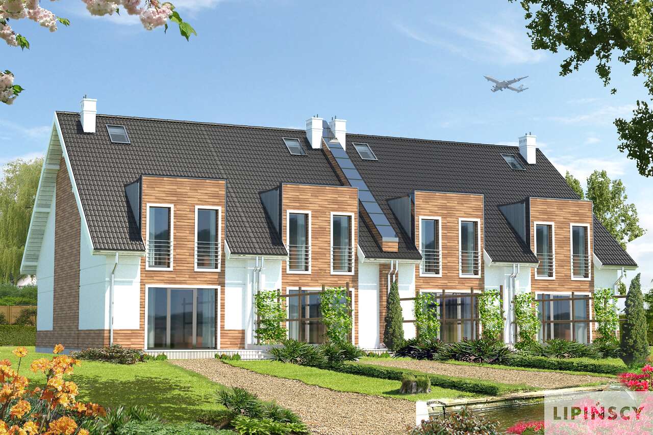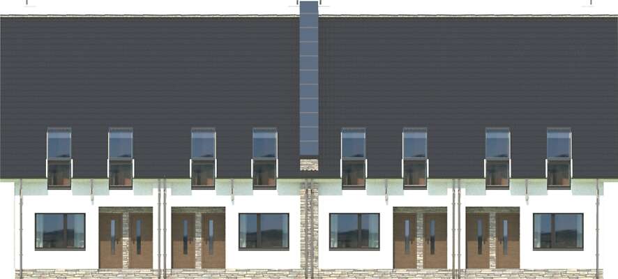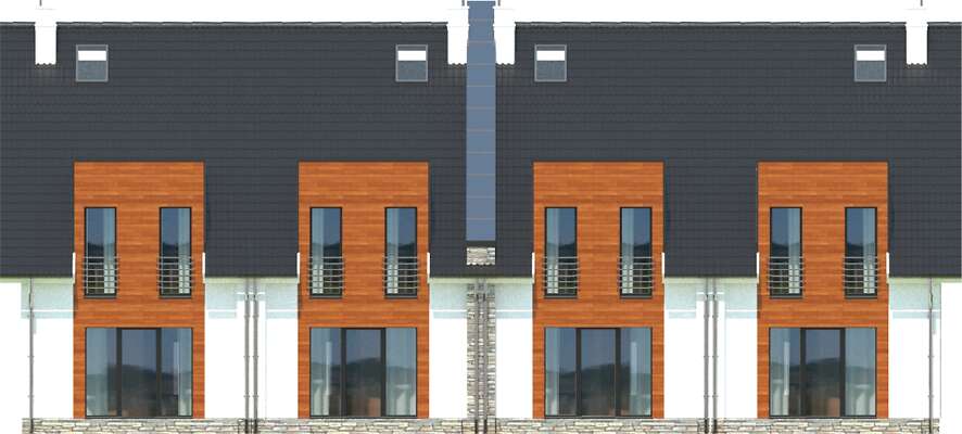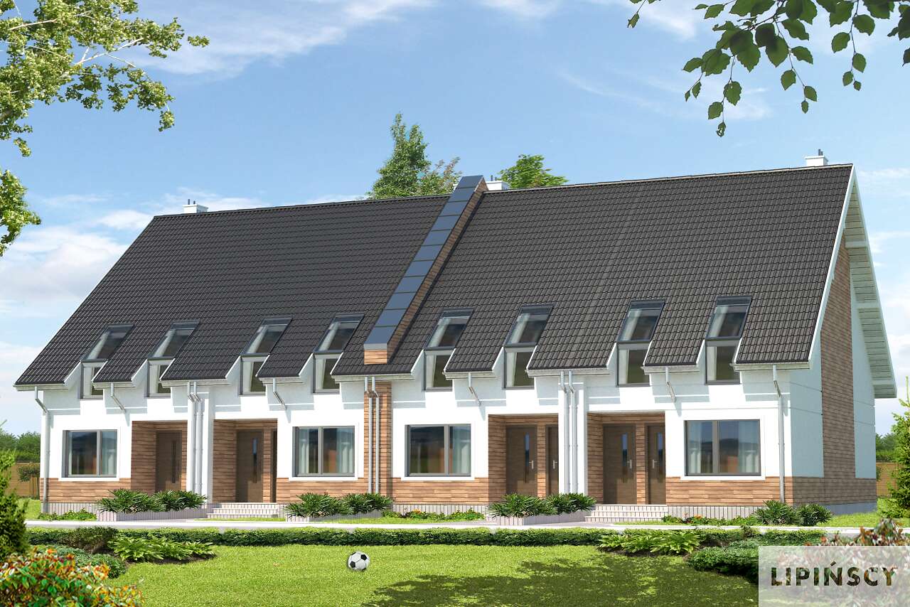 Dom przeznaczony do zabudowy szeregowej lub bliźniaczej. W jednym segmencie zlokalizowano dwa mieszkania. Na parterze, na powierzchni prawie 60m² zlokalizowano salon z wyjściem na ogród i aneksem kuchennym, łazienkę, gdzie jest kocioł grzewczy oraz sypialnię. Na poddaszu mieszkanie ma niemal 60m² i jest w nim salon z aneksem kuchennym, dwie niewielkie sypialnie oraz łazienka. Bryła tego projektu zwraca uwagę głównie swoją prostotą i nowoczesnym charakterem.