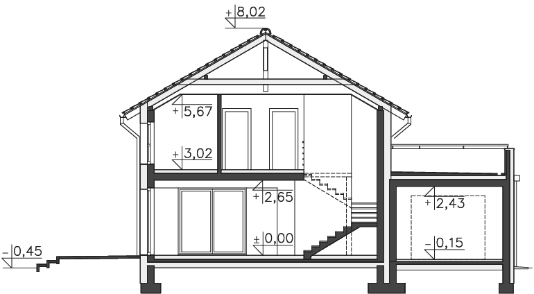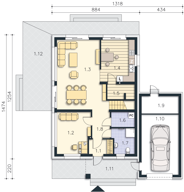Duże przeszklenia w salonie powinny być od strony południowo - zachodniej. Dostępna jest wersja lustrzanego odbicia.