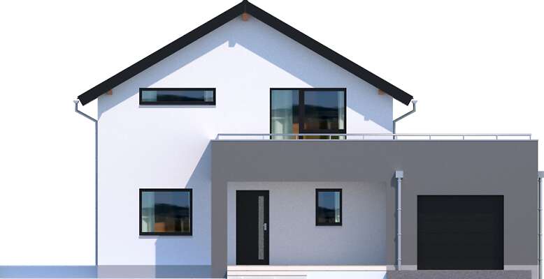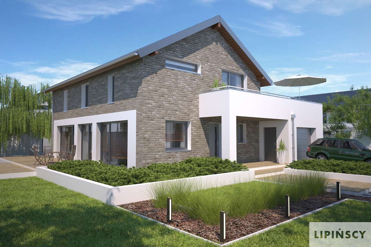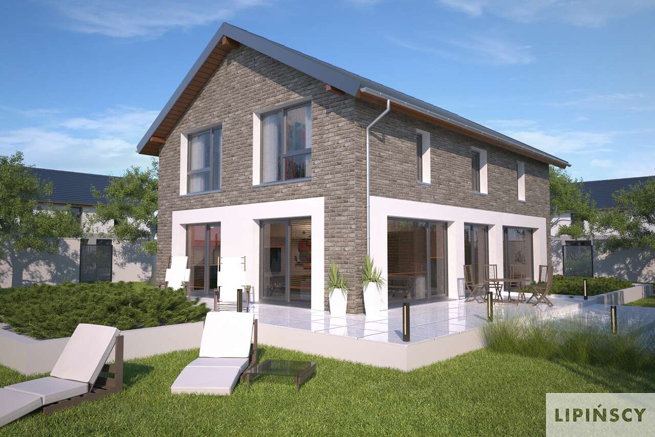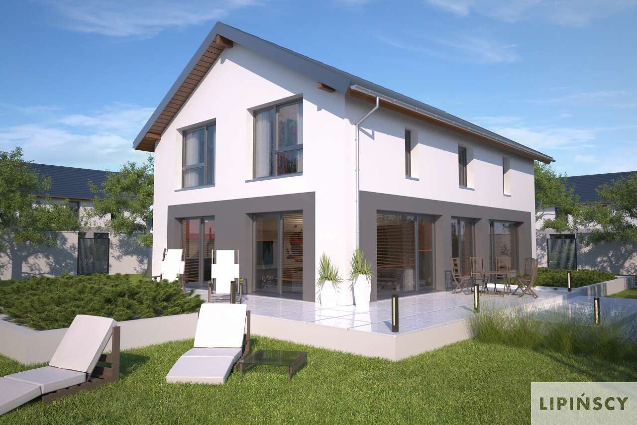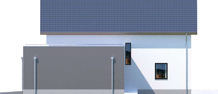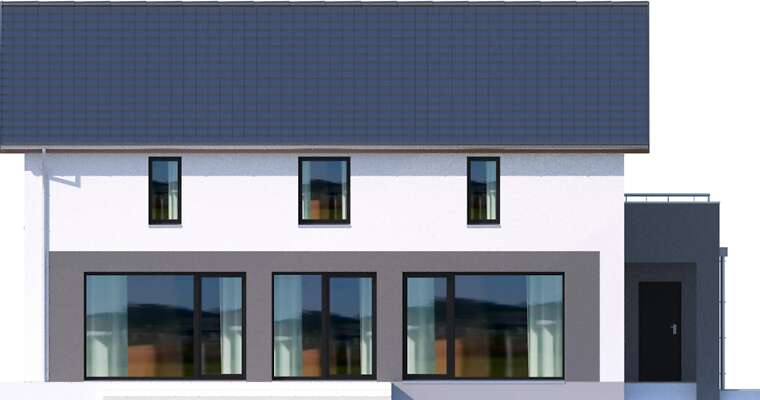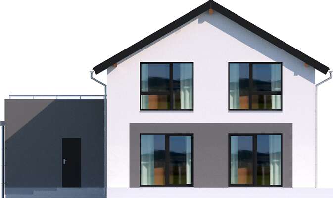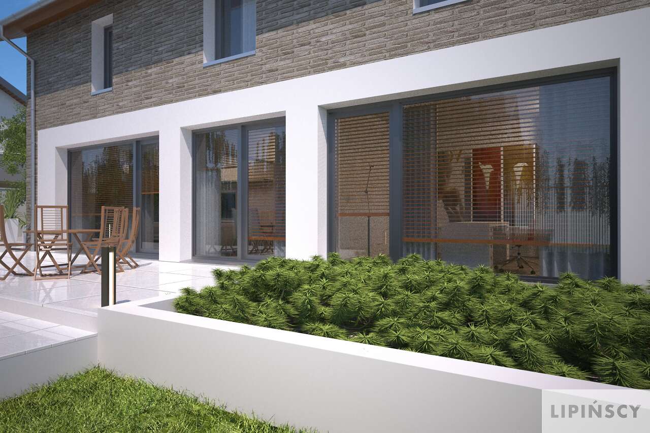 Duży, efektowny dom energooszczędny, w którym niewątpliwym atutem są przeszklenia i tarasy. Dom jest otwarty na ogród. Do dyspozycji mieszkańców są trzy przestronne sypialnie i komfortowa łazienka. Na parterze salon z jadalną jest miejscem idealnym do spędzania wspólnie wolnego czasu. Dodatkowy pokój na parterze może być zaaranżowany jako gabinet lub sypialnia dla gości. W projekcie znalazło się miejsce na wiele pomieszczeń pomocniczych. Jest pralnia, gdzie umieszczono rekuperator, pomieszczenie gospodarcze, w którym zlokalizowana jest jednostka pompy ciepła, spiżarnia dostępna z kuchni oraz garaż i pomieszczenie z niezależnym wyjściem na zewnątrz, gdzie można przechowywać meble ogrodowe i rowery. Dostępna jest wersja projektu z kotłownią za garażem z piecem gazowym.