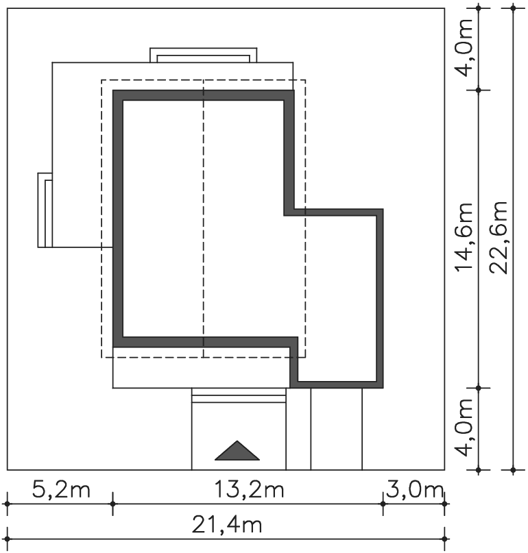 Grafika przedstawia minimalne wymiary działki. Aby sprawdzić, czy dom może być realizowany na konkretnej działce należy uzyskać Wypis i Wyrys z Miejscowego Planu Zagospodarowania Przestrzennego lub jeśli na danym terenie nie ma planu – Decyzję o warunkach zabudowy. Wszystkie projekty wymagają adaptacji do warunków miejscowych przez projektanta lokalnego.