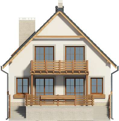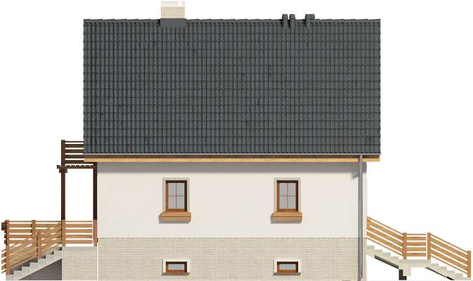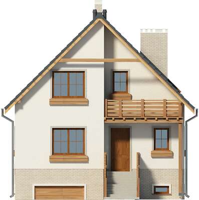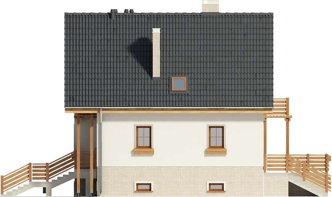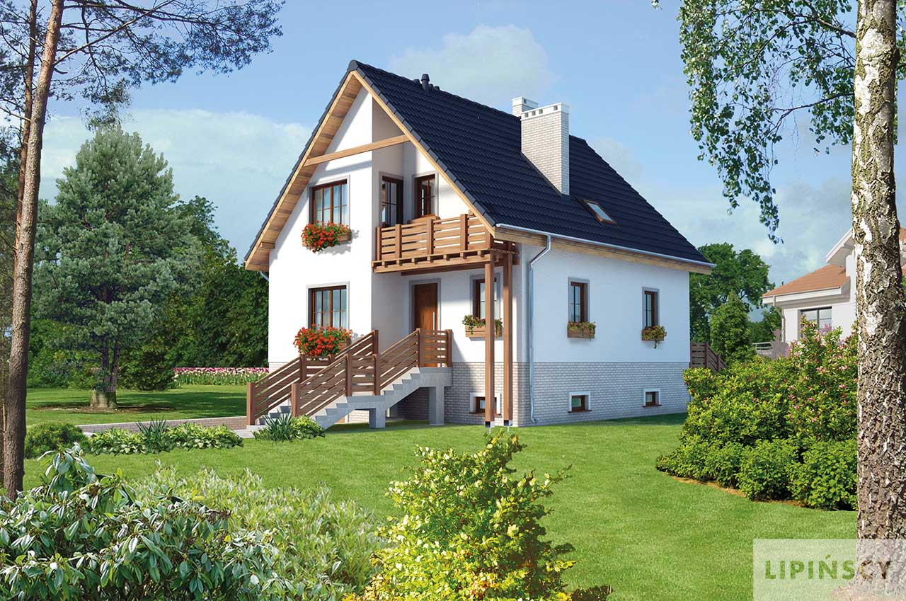 Dzięki swojej zwartej bryle dom jest łatwy i tani w budowie. Dom doskonale wkomponowuje się zarówno w zabudowę siedliskową jak i podmiejską. Nadziemna część domu mieści w sobie strefę dzienną, na wysokim parterze i strefę nocną na poddaszu. W piwnicy umieszczono pomieszczenia gospodarcze z c.o. oraz garaż. Na parterze z wygodnego salonu z kominkiem przejść możemy na obszerny taras, jak i do otwartej kuchni. Na poziomie tym znajduje się również pokój, w którym urządzić można gabinet lub sypialnię. W pobliżu pokoju znajduje się łazienka. Dom dostępny jest w wersji bez piwnicy. W projekcie przewidziano ogrzewanie kotłem na gaz. Możliwa jest zmiana ogrzewania na pompę ciepła.