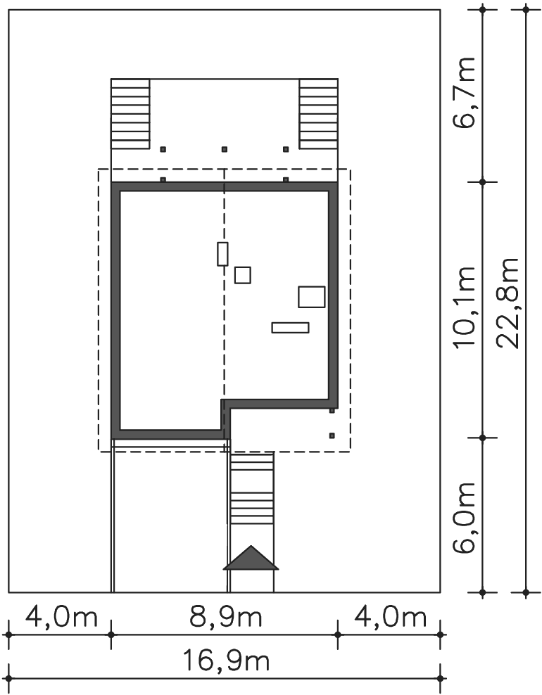 Grafika przedstawia minimalne wymiary działki. Aby sprawdzić, czy dom może być realizowany na konkretnej działce należy uzyskać Wypis i Wyrys z Miejscowego Planu Zagospodarowania Przestrzennego lub jeśli na danym terenie nie ma planu – Decyzję o warunkach zabudowy. Wszystkie projekty wymagają adaptacji do warunków miejscowych przez projektanta lokalnego.