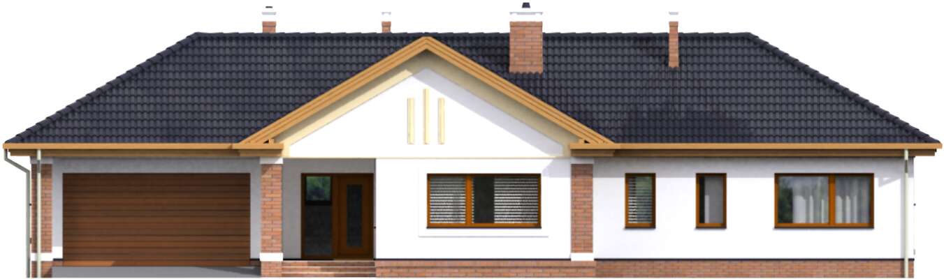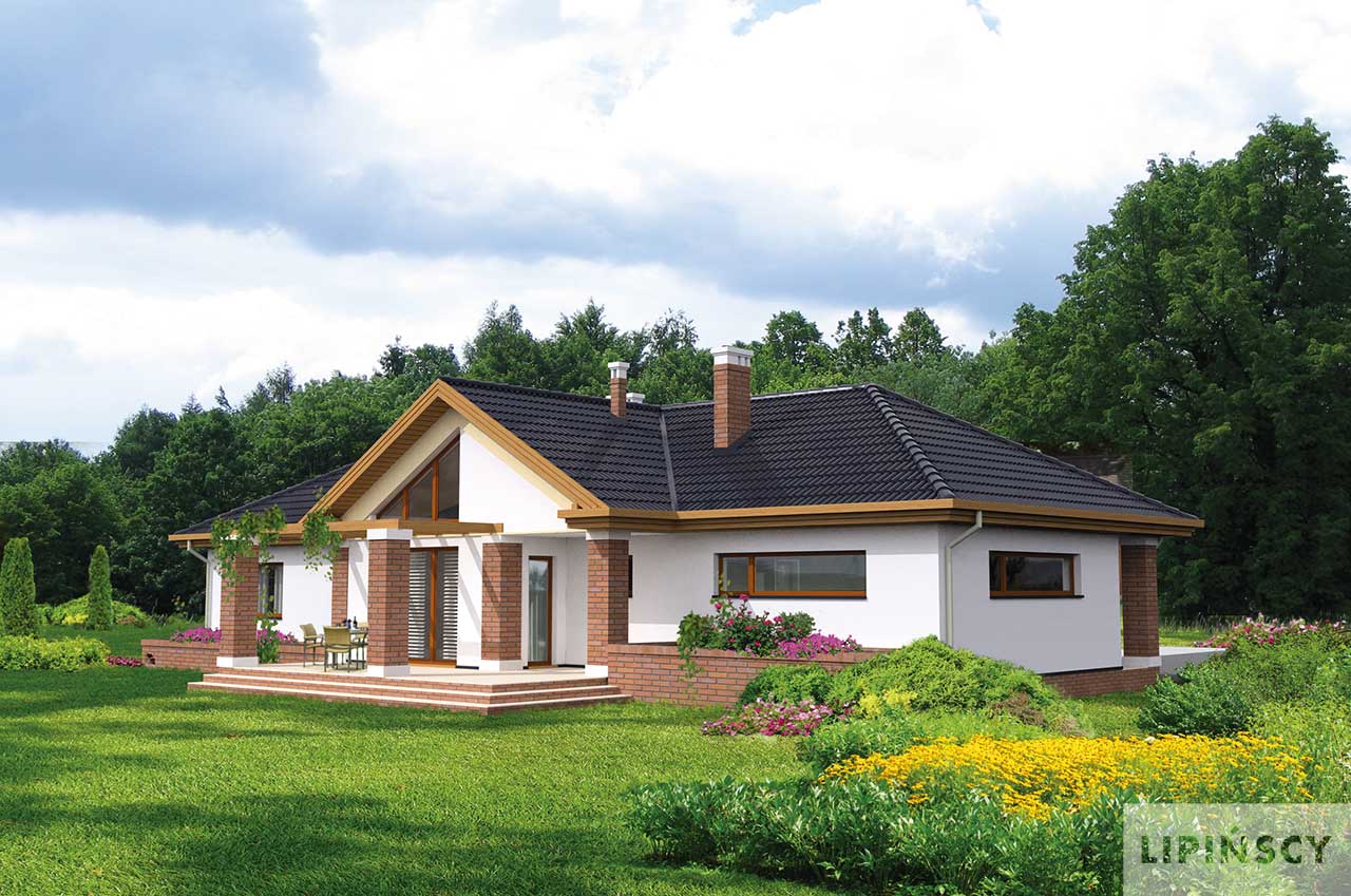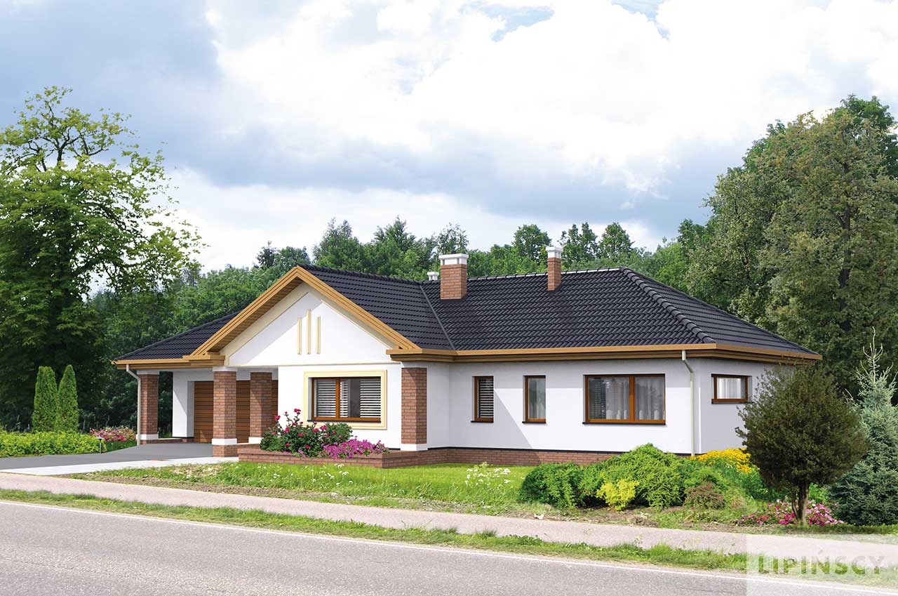 Przytulny dom parterowy, z wielospadowym dachem, w bryłę którego został wkomponowany duży garaż. Ciekawie zaaranżowane wejście, ze wspartym na dwóch słupach gankiem, zaprasza do wygodnego wnętrza. Podzielono je na ustawną wydzieloną kuchnię, salon z kominkiem oraz na część prywatną, w której znajdują się trzy sypialnie, w tym jedna z własną łazienką. Ozdobą domu jest częściowo zadaszony taras ogrodowy, doskonały do spędzania czasu na świeżym powietrzu. Dom sprawdzi się na szerokich działkach, ale przy zmianie wjazdu do garażu można zlokalizować go również na węższej, ale dłuższej działce. Projekt posiada również wersję z płaskim dachem.